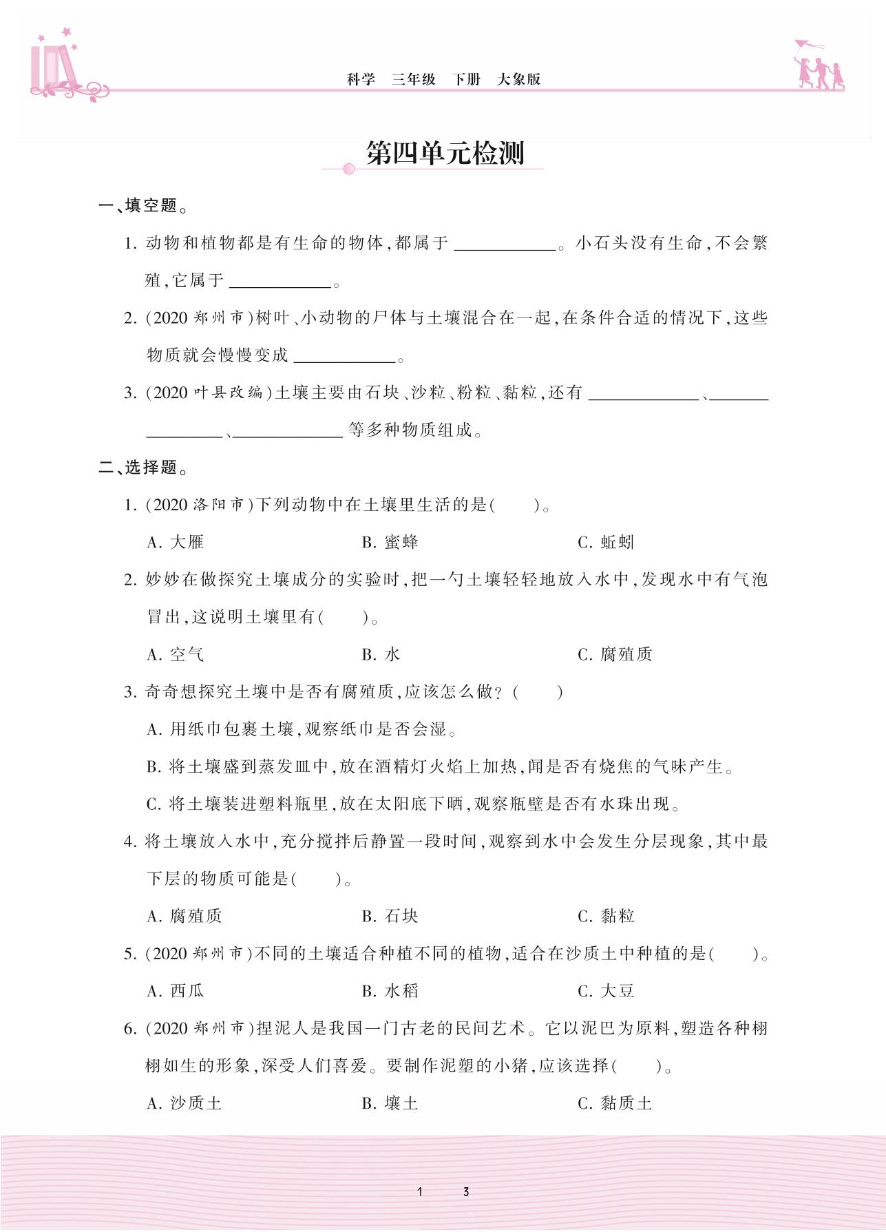 2021下册三年级科学大象版 第四单元 土壤,生命的家园——第四单元检测
