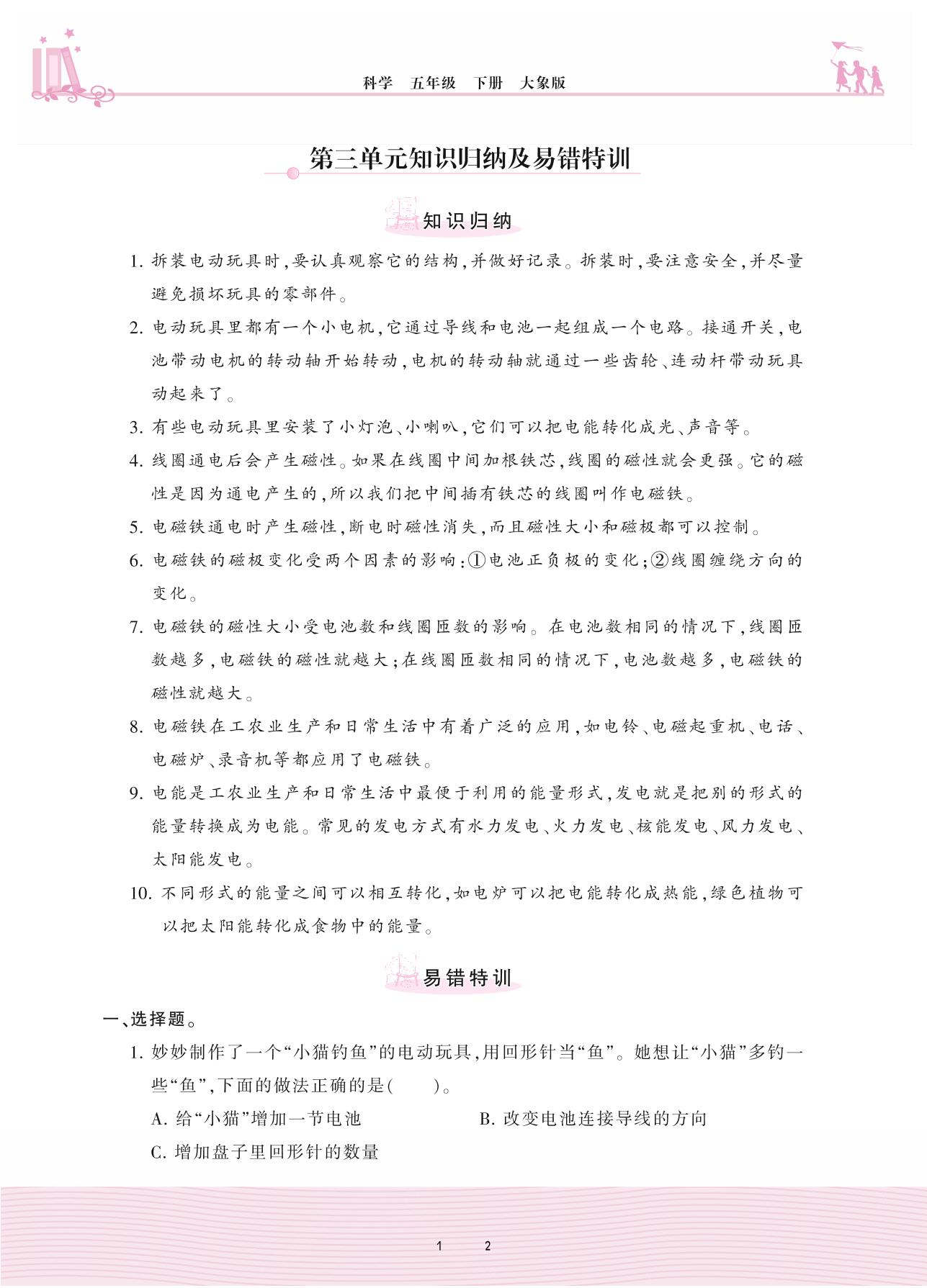 2021下册五年级科学大象版 第三单元 玩具总动员——第三单元知识归纳及易错特训