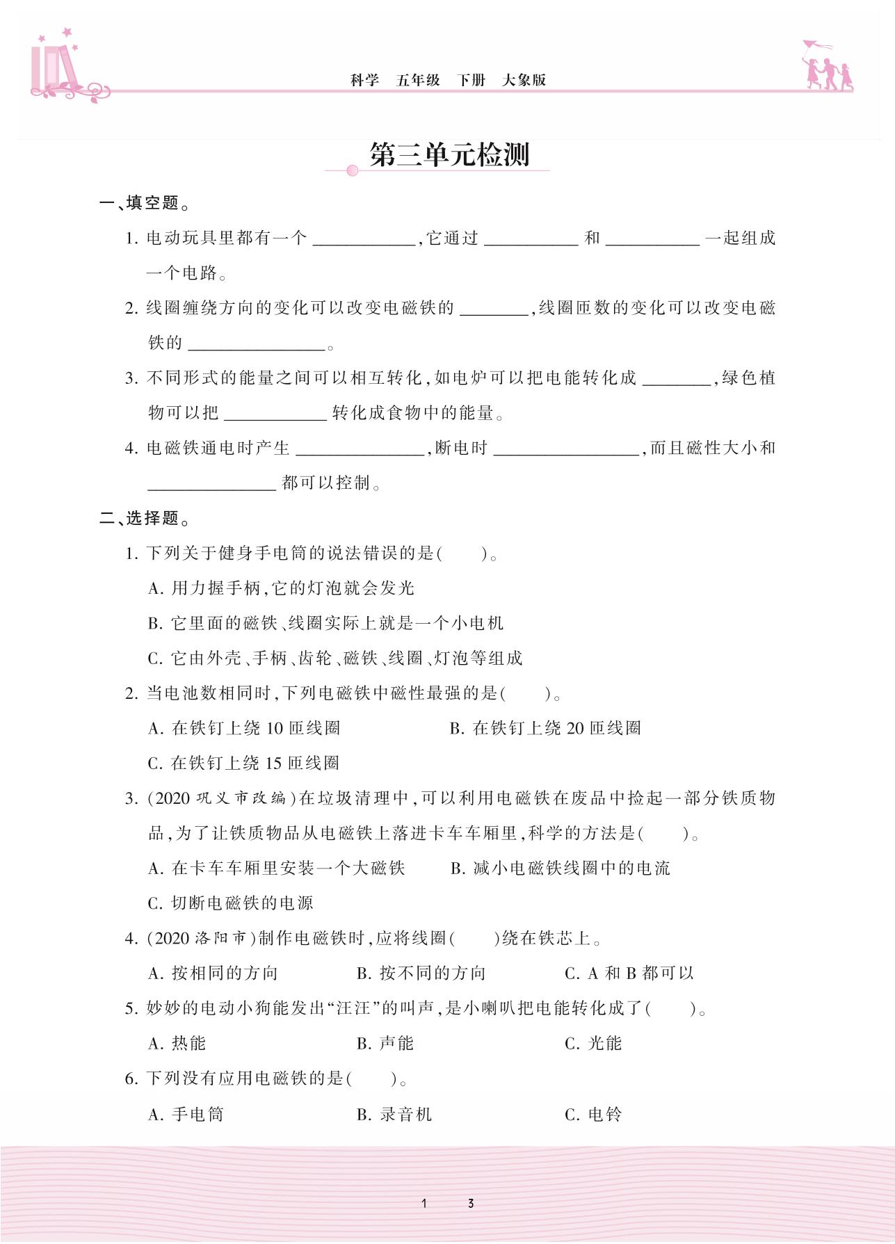 2021下册五年级科学大象版 第三单元 玩具总动员——第三单元检测