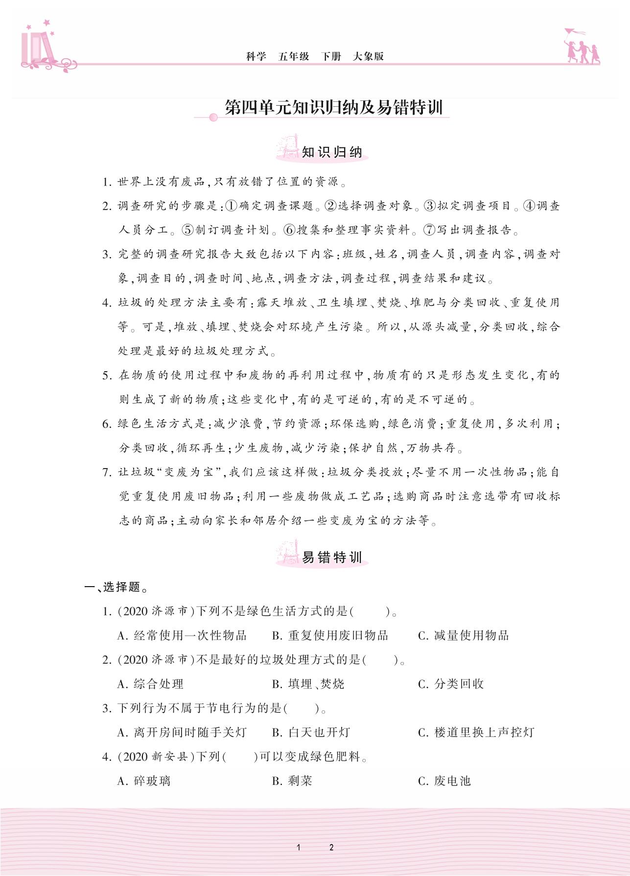 2021下册五年级科学大象版 第四单元 变废为宝——第四单元知识归纳及易错特训