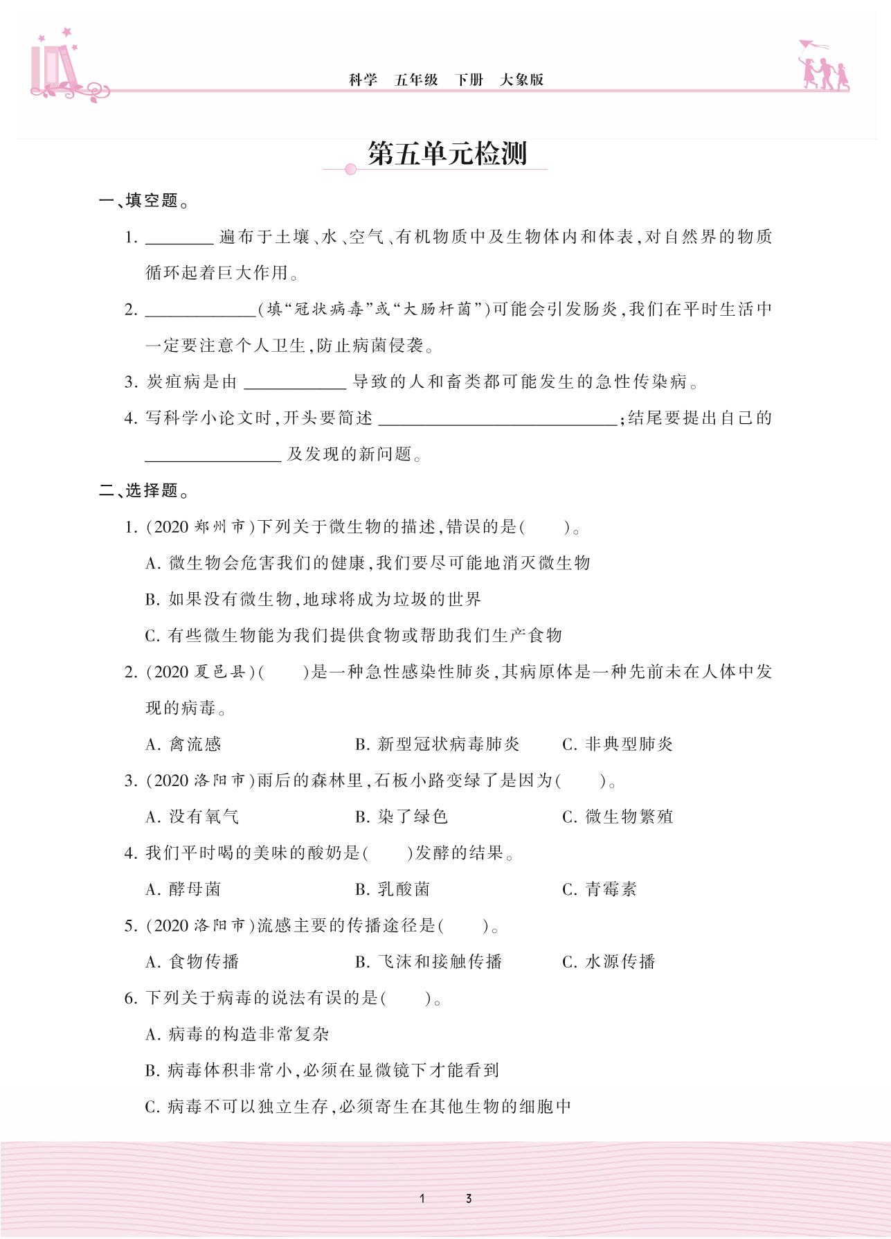 2021下册五年级科学大象版 第五单元 形形色色的微生物——第五单元检测
