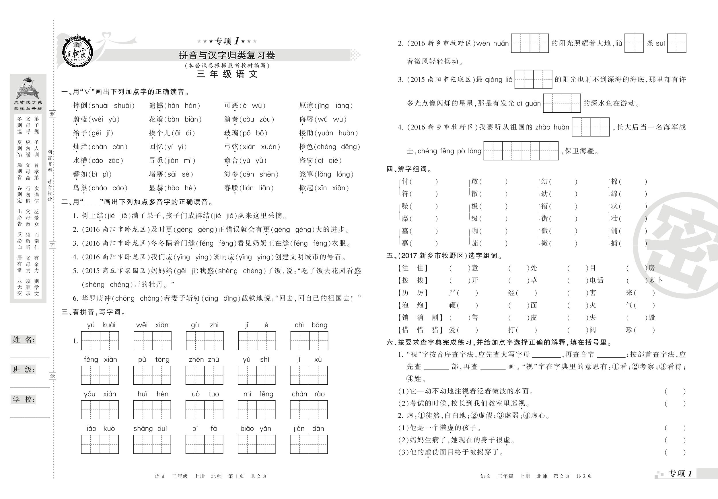 王朝霞期末专项卷——拼音与汉字、词语真题归类复习三年级上册语文(北师版)【0】