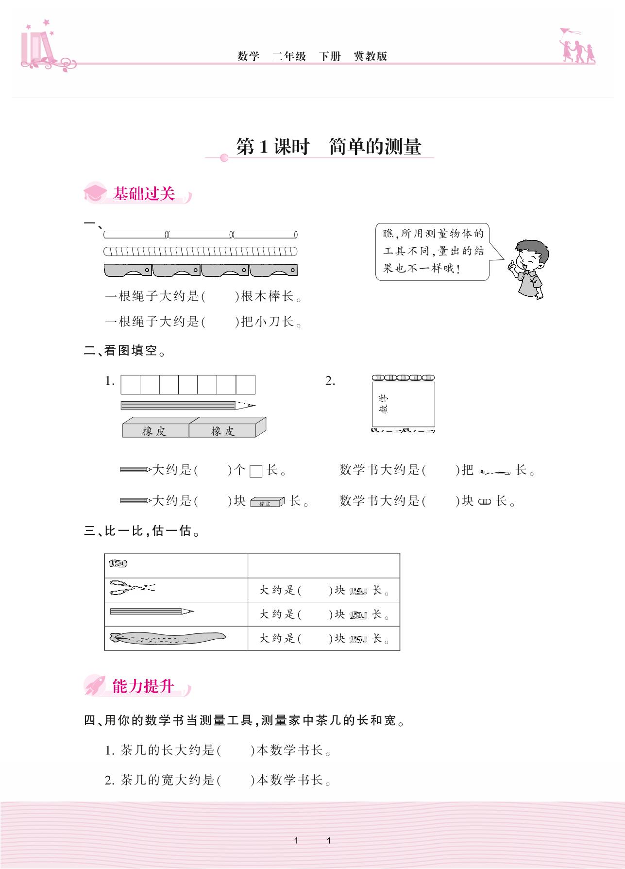 2021下册二年级数学冀教版 一 厘米、分米、米——第1课时 简单的测量