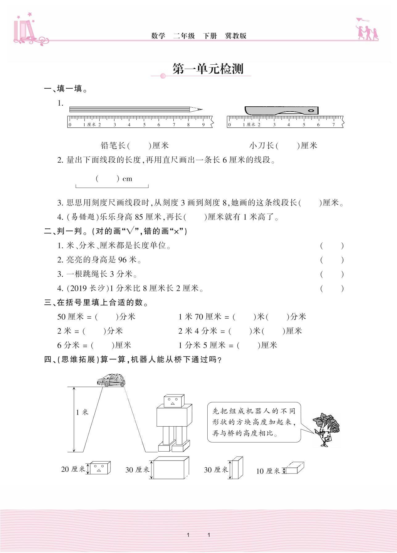 2021下册二年级数学冀教版 一 厘米、分米、米——第一单元检测