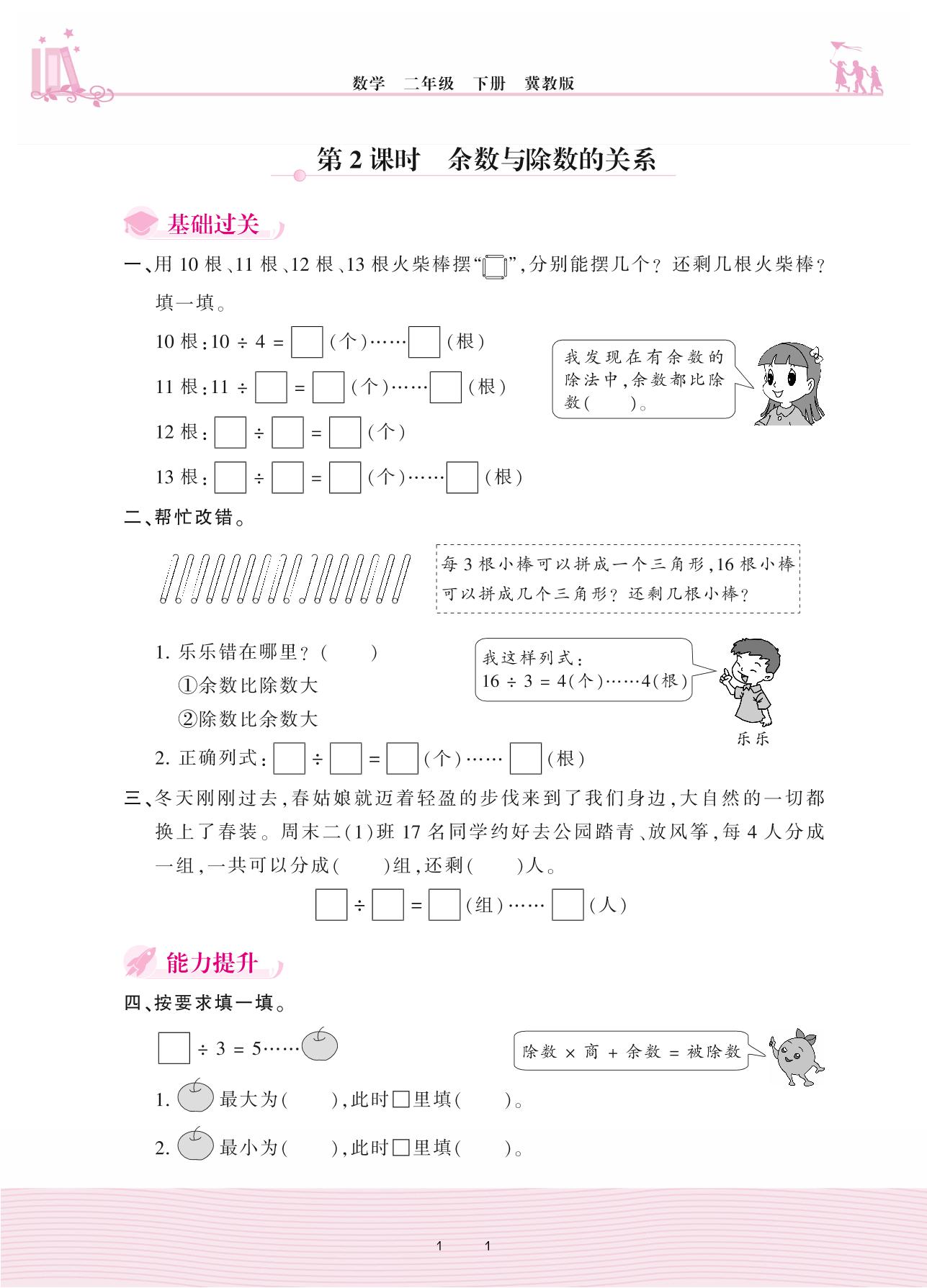 2021下册二年级数学冀教版 二 有余数的除法——第2课时 余数与除数的关系
