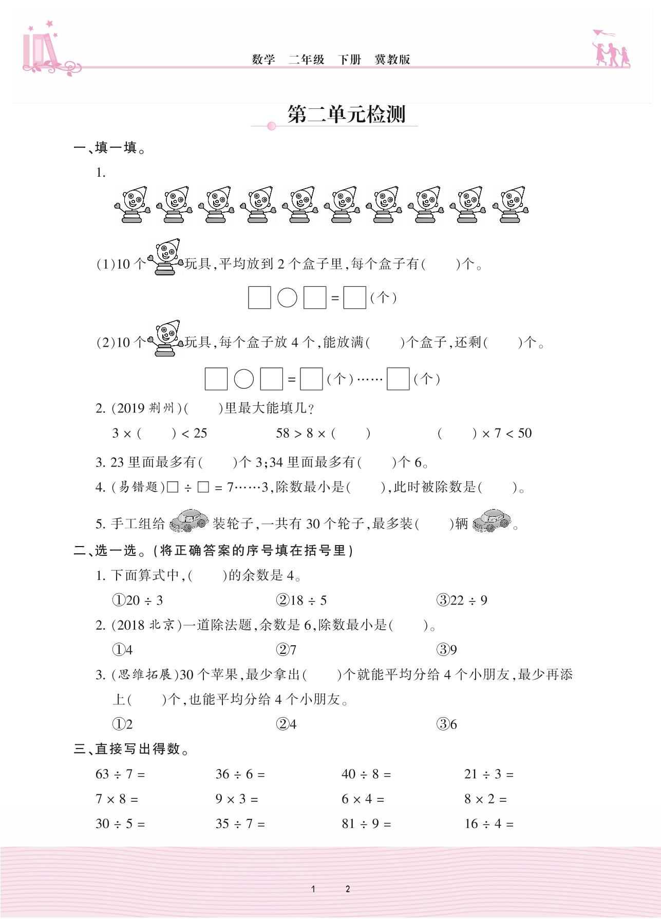 2021下册二年级数学冀教版 二 有余数的除法——第二单元检测