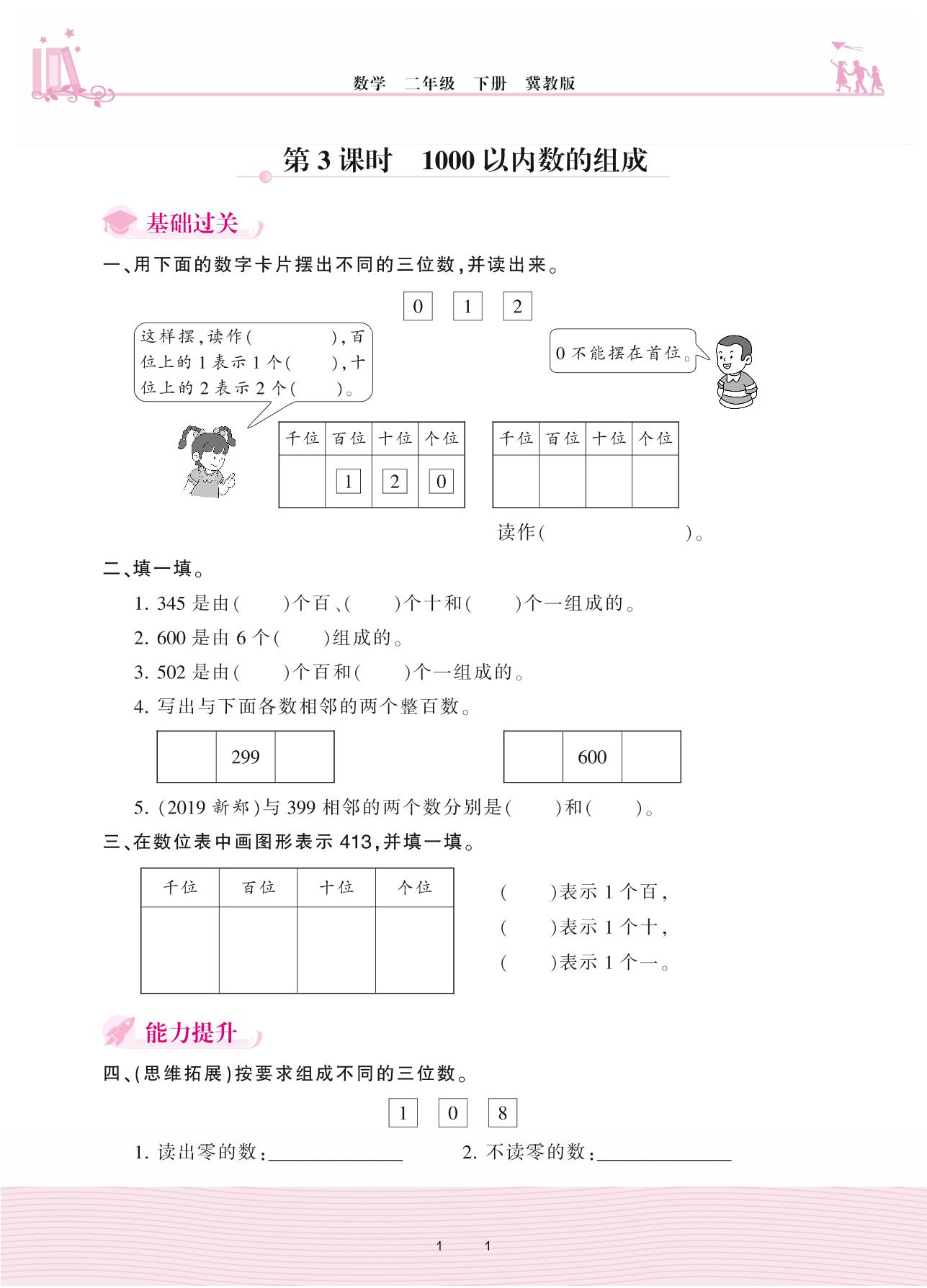 2021下册二年级数学冀教版 三 认识1000以内的数——第3课时 1000以内数的组成