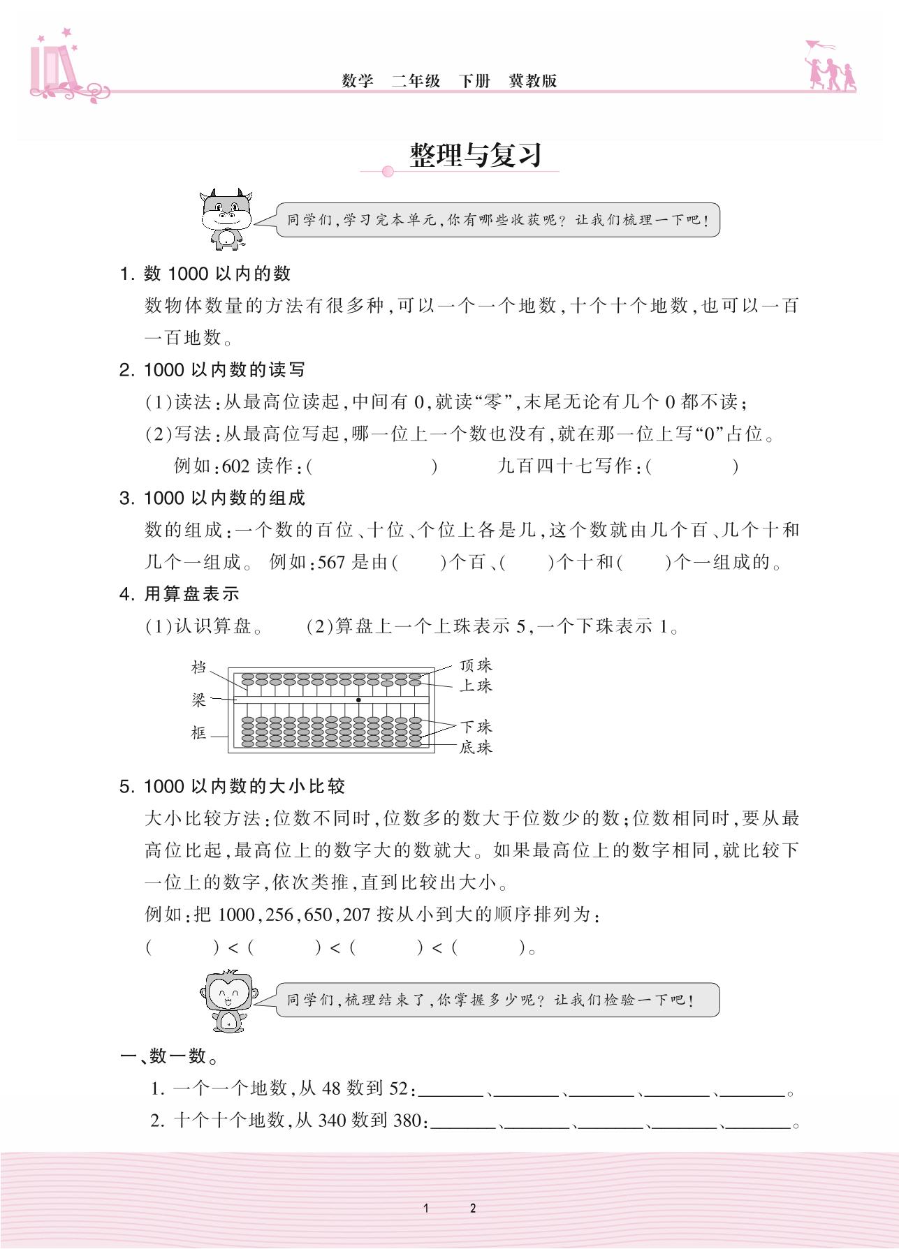 2021下册二年级数学冀教版 三 认识1000以内的数——整理与复习