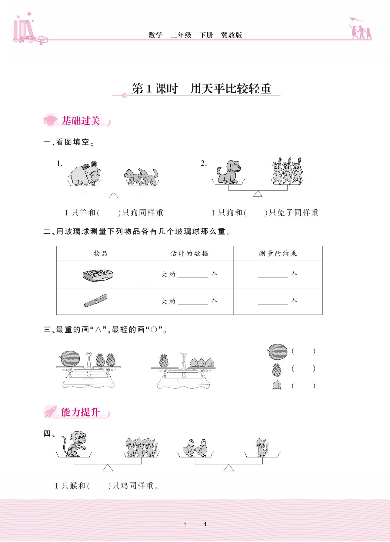 2021下册二年级数学冀教版 四 千克和克——第1课时 用天平比较轻重