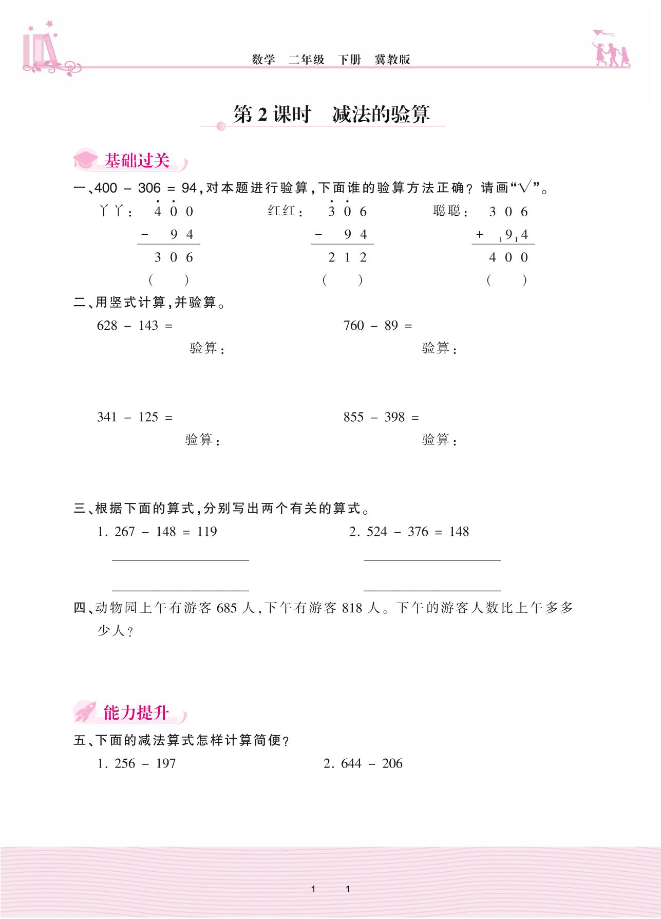 2021下册二年级数学冀教版 六 三位数加减三位数 3. 加减法验算——第2课时 减法的验算