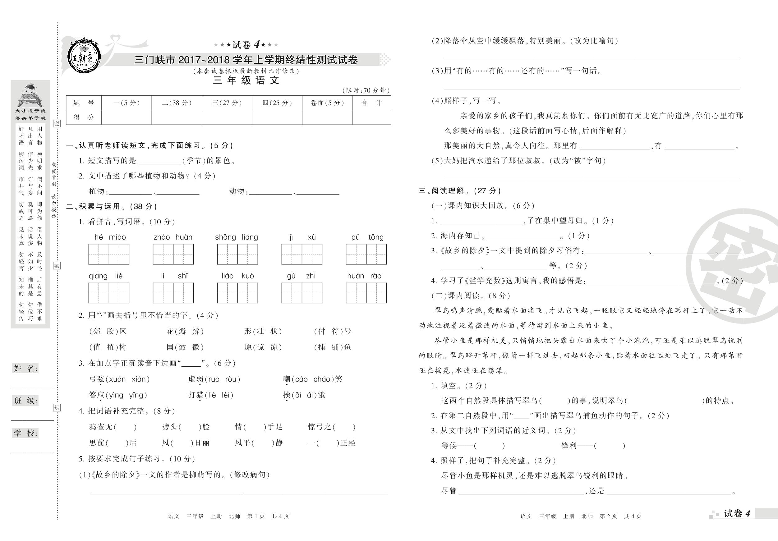 2017-2018学年第一学期三门峡市三年级语文试卷(北师版)【4】