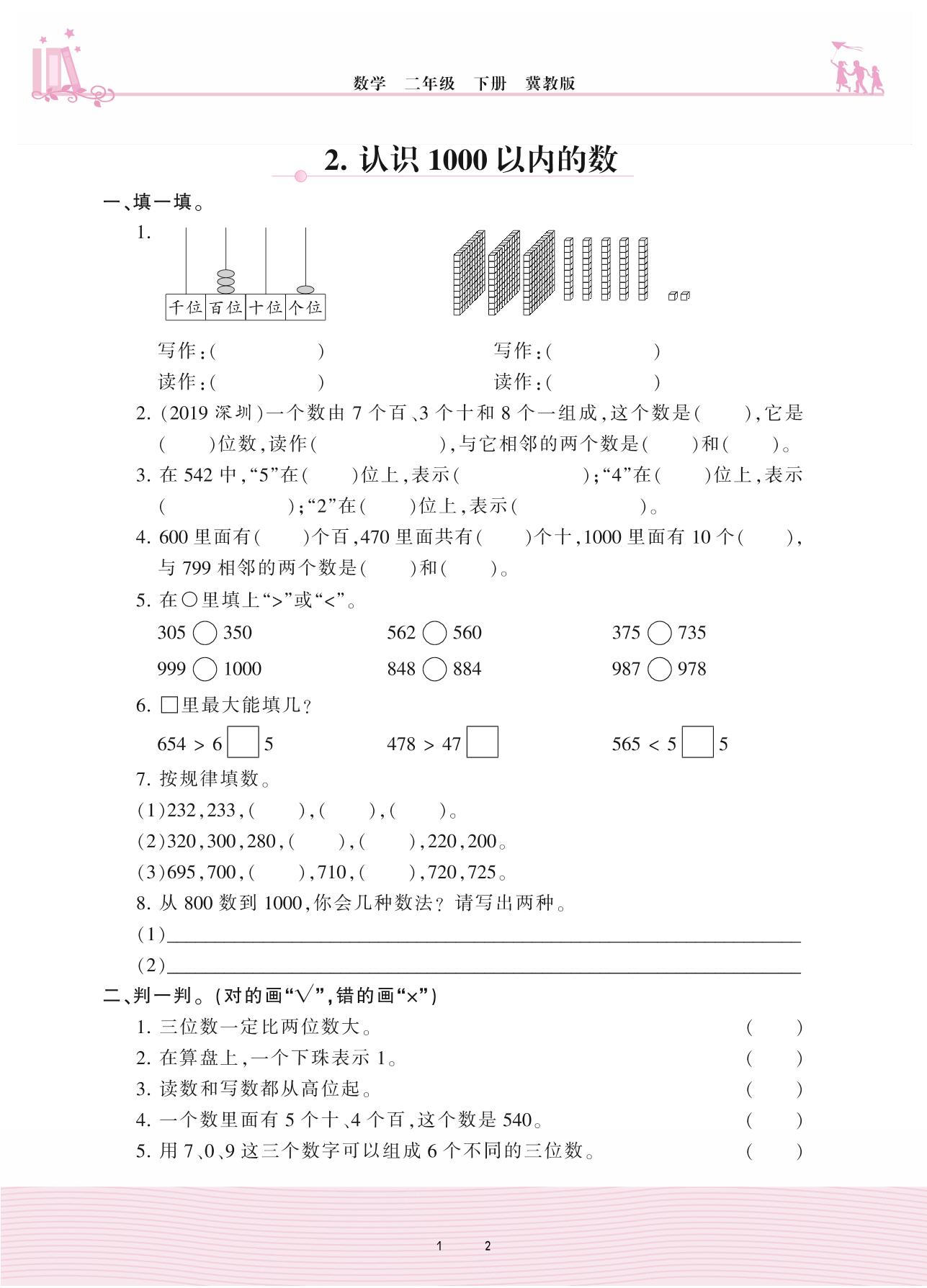 2021下册二年级数学冀教版 整理与评价——2. 认识1000以内的数