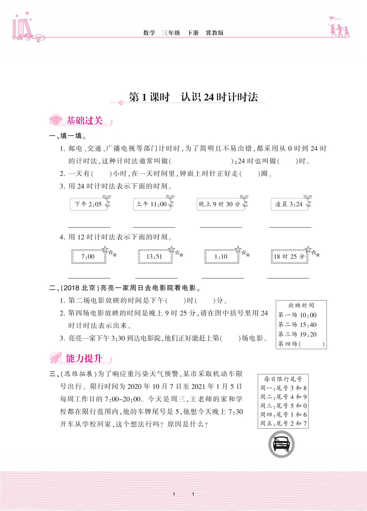 2021下册三年级数学冀教版 一 年、月、日 1. 24时计时法——第1课时 认识24时计时法