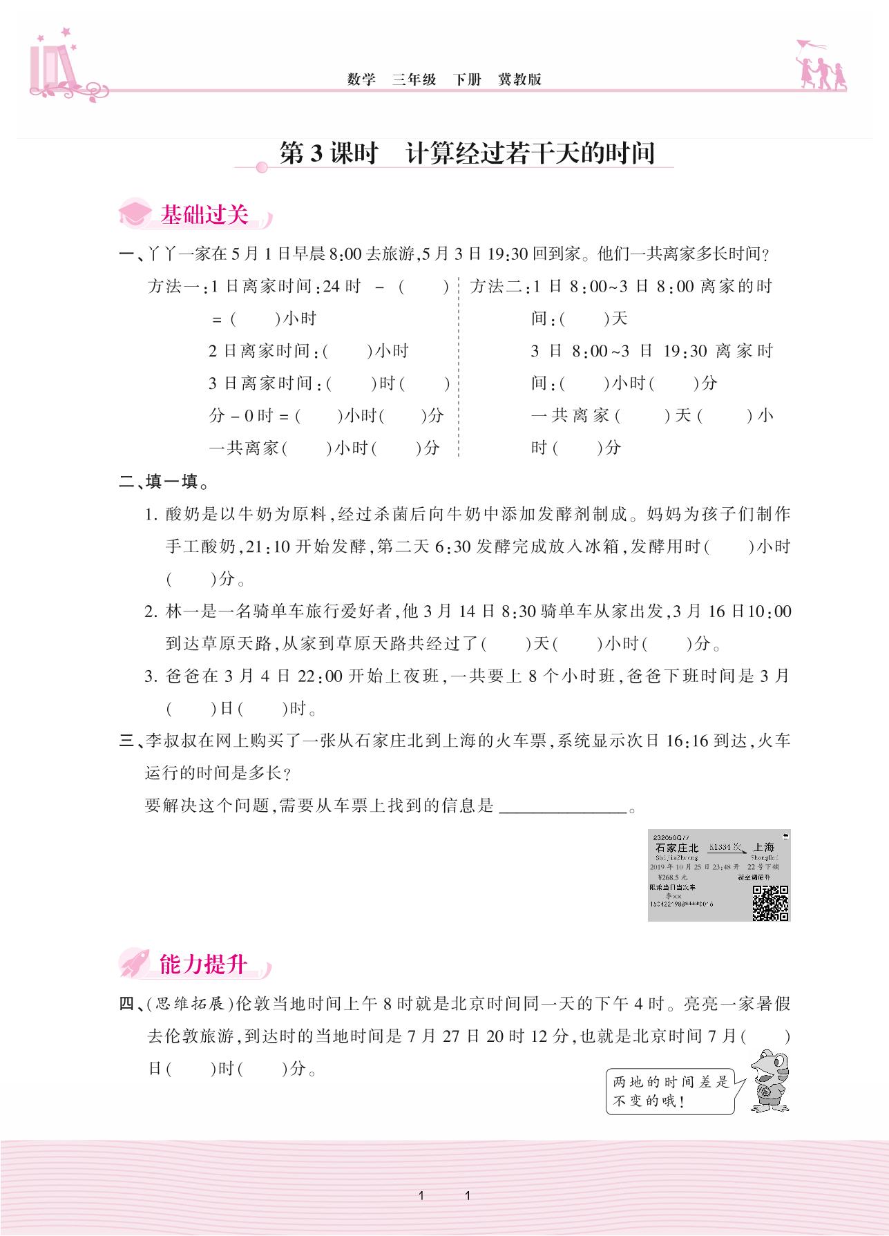 2021下册三年级数学冀教版 一 年、月、日 1. 24时计时法——第3课时 计算经过若干天的时间