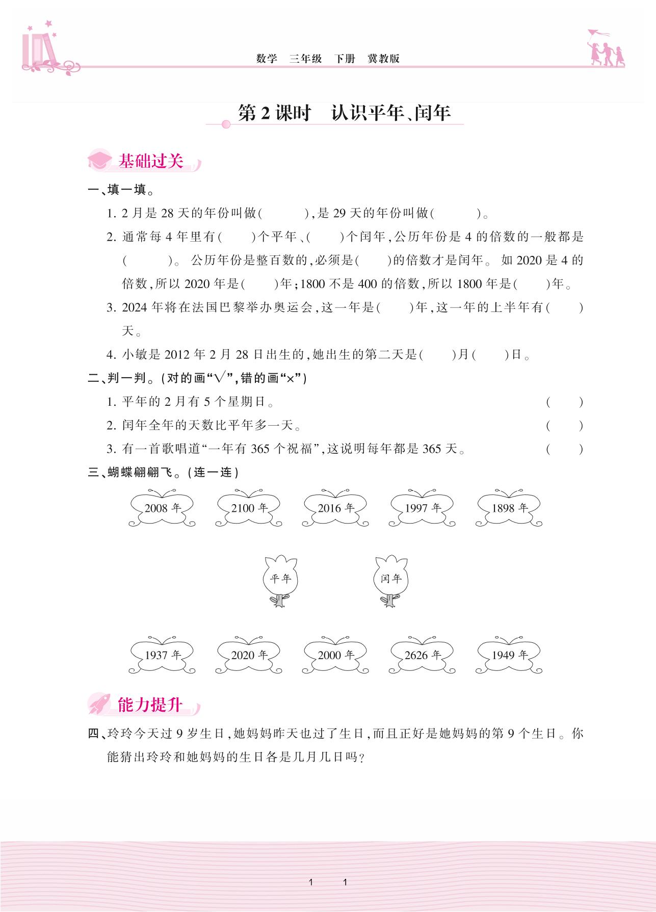 2021下册三年级数学冀教版 一 年、月、日 2. 年、月、日——第2课时 认识平年、闰年