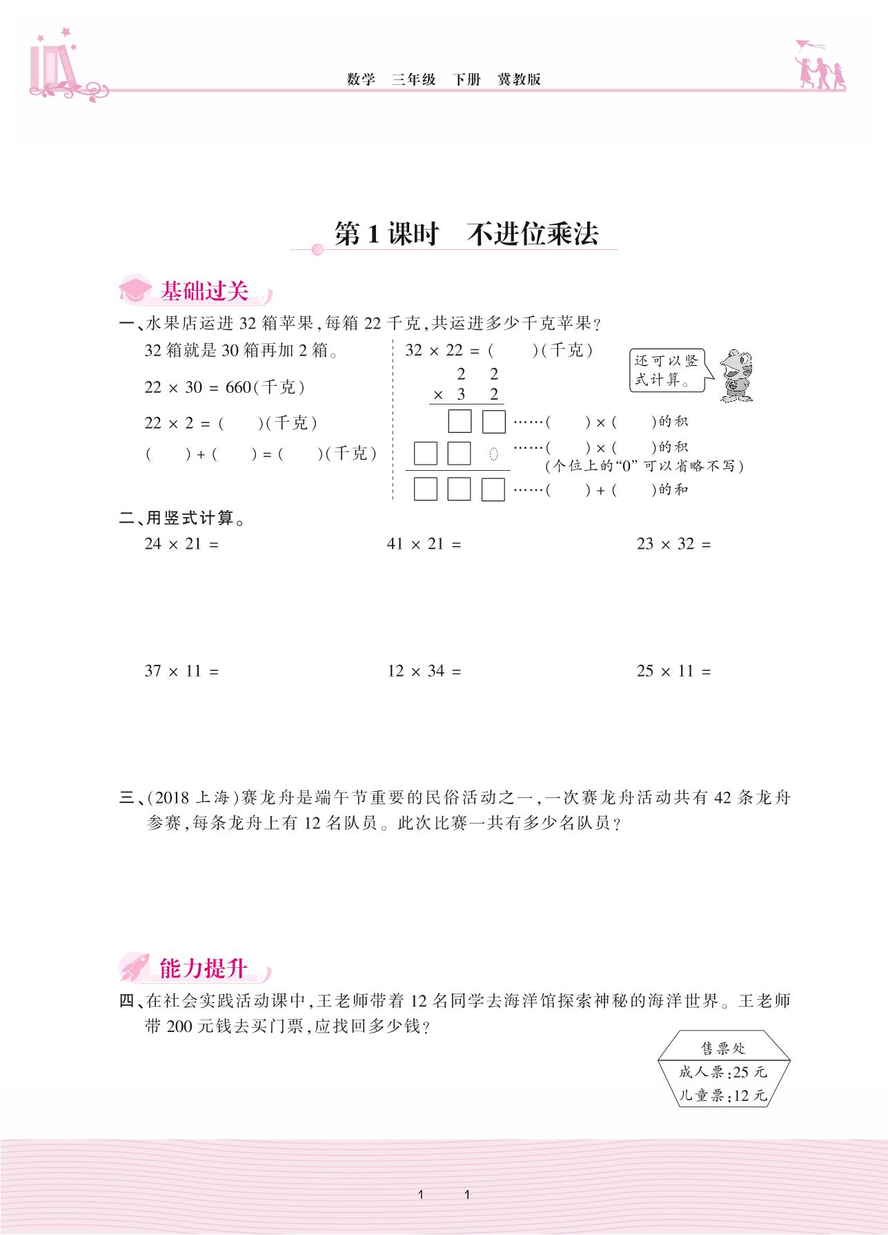2021下册三年级数学冀教版 二 两位数乘两位数 1. 乘法——第1课时 不进位乘法