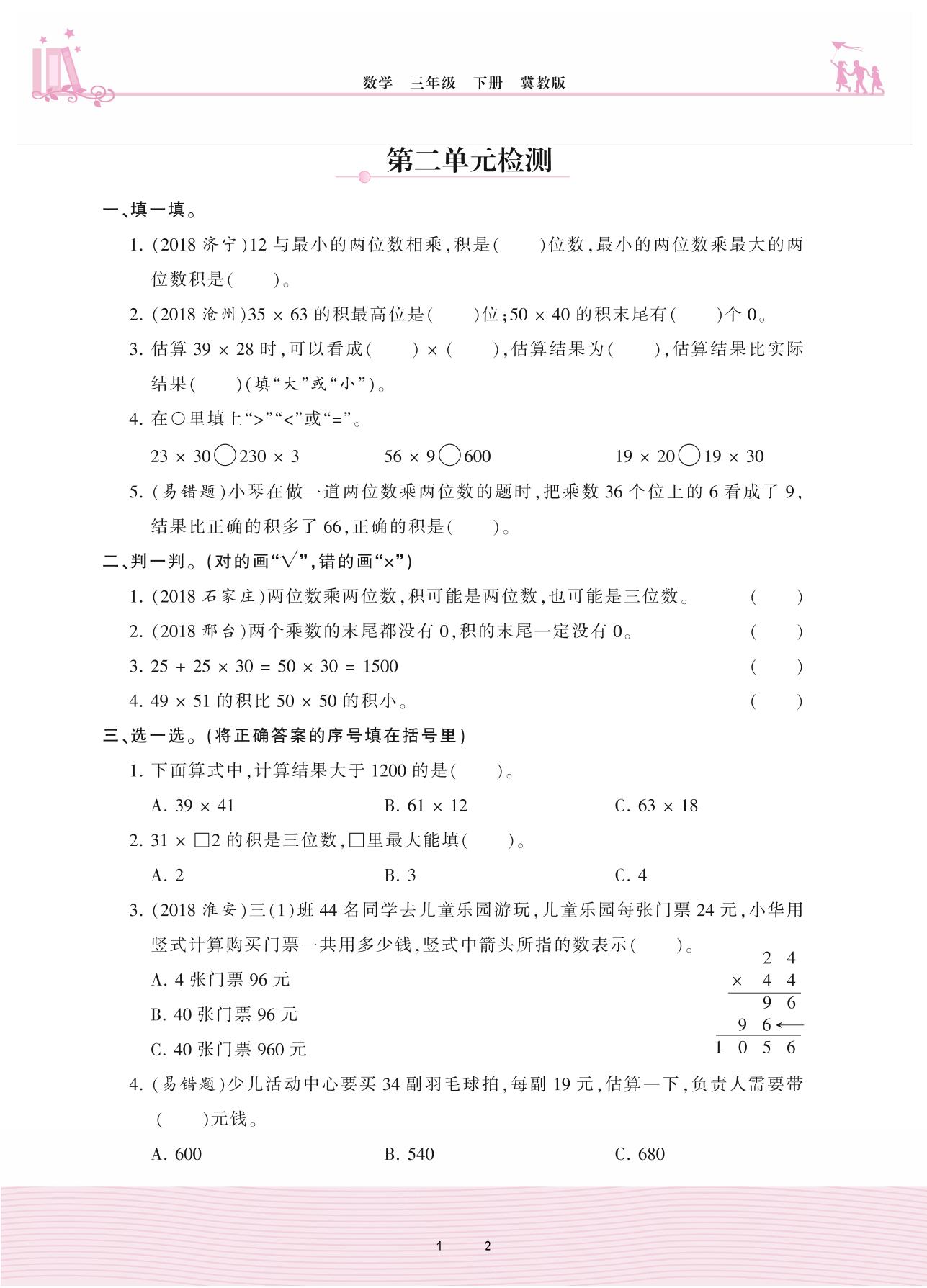 2021下册三年级数学冀教版 二 两位数乘两位数——第二单元检测