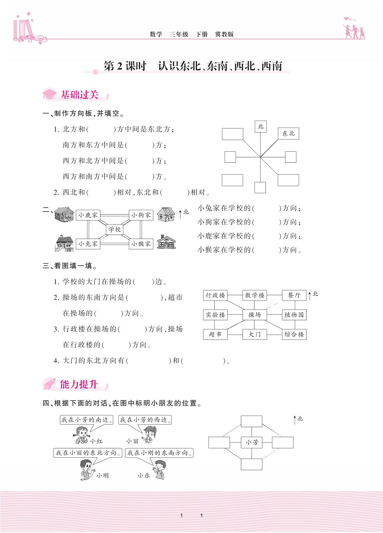 2021下册三年级数学冀教版 三 辨认方向——第2课时 认识东北、东南、西北、西南