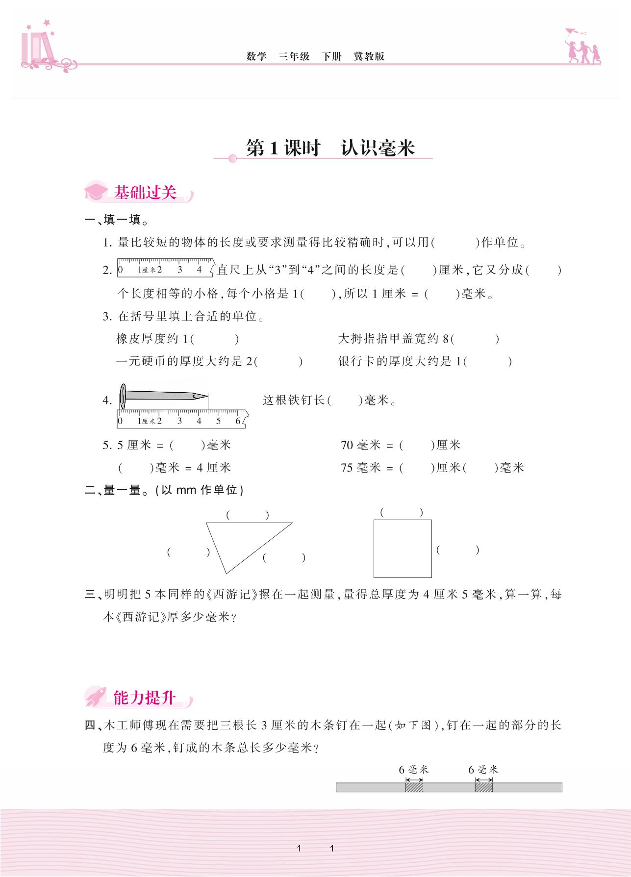2021下册三年级数学冀教版 四 毫米和千米——第1课时 认识毫米