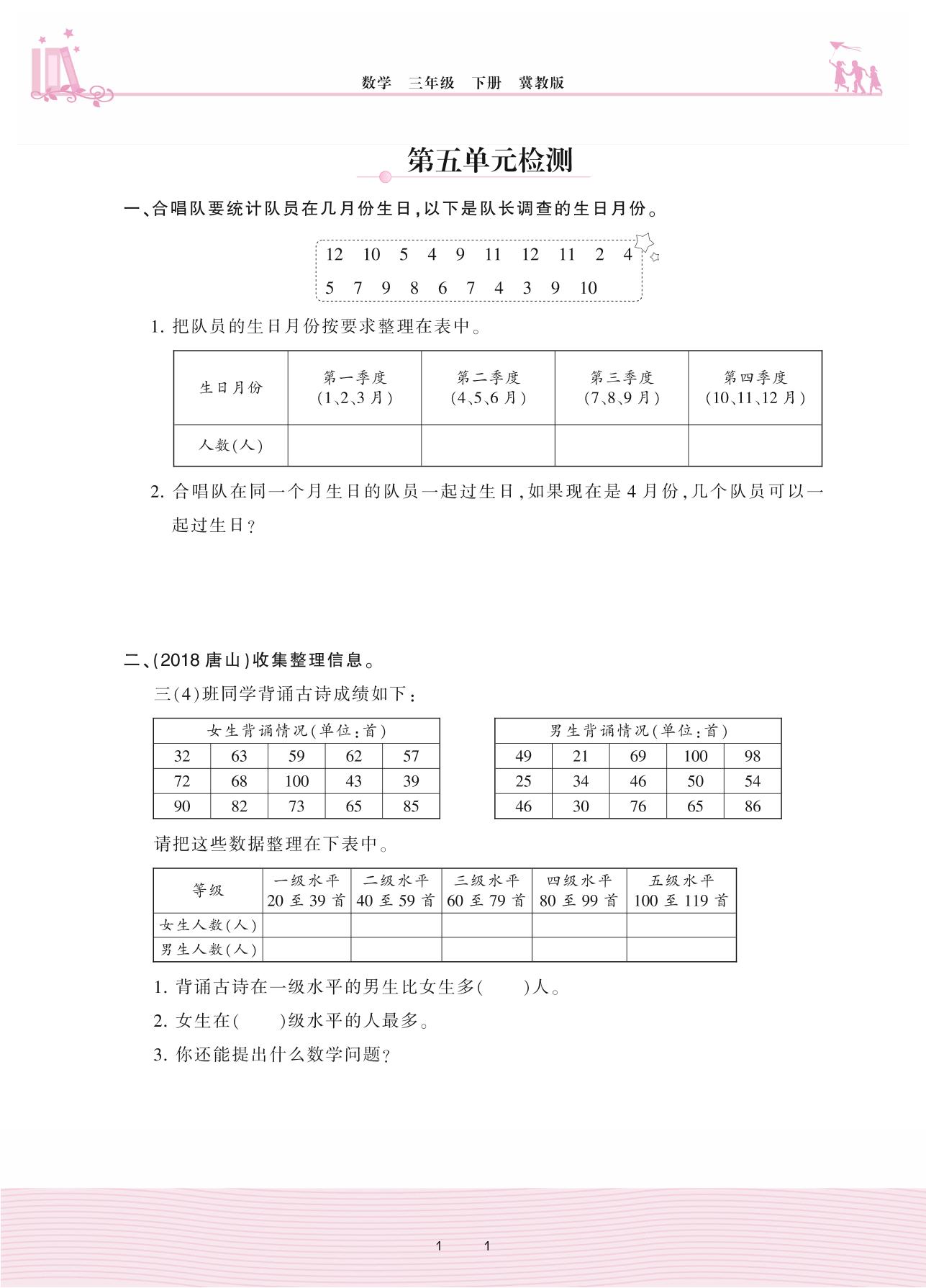 2021下册三年级数学冀教版 五 数据的收集和整理——第五单元检测