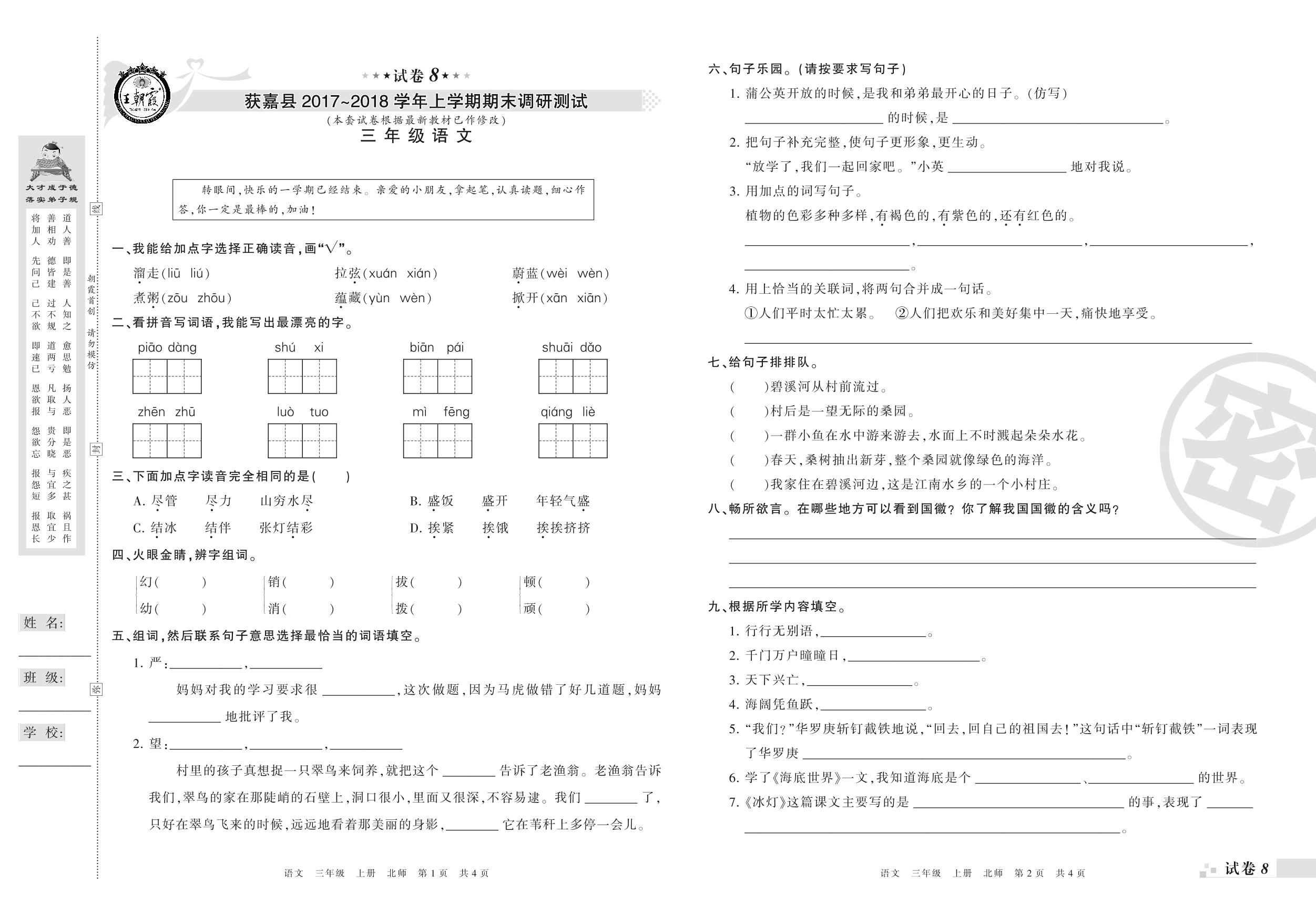 2017-2018学年第一学期新乡市获嘉县三年级语文试卷(北师版)【8】