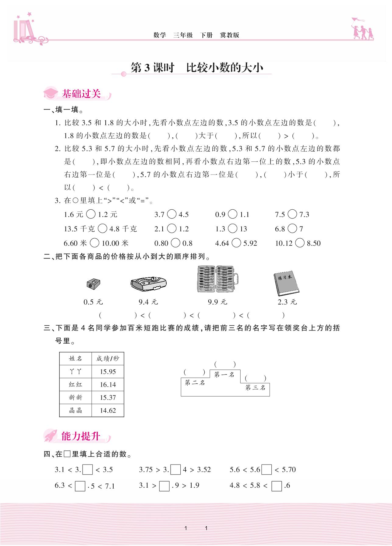 2021下册三年级数学冀教版 六 小数的初步认识 1. 认识小数——第3课时 比较小数的大小