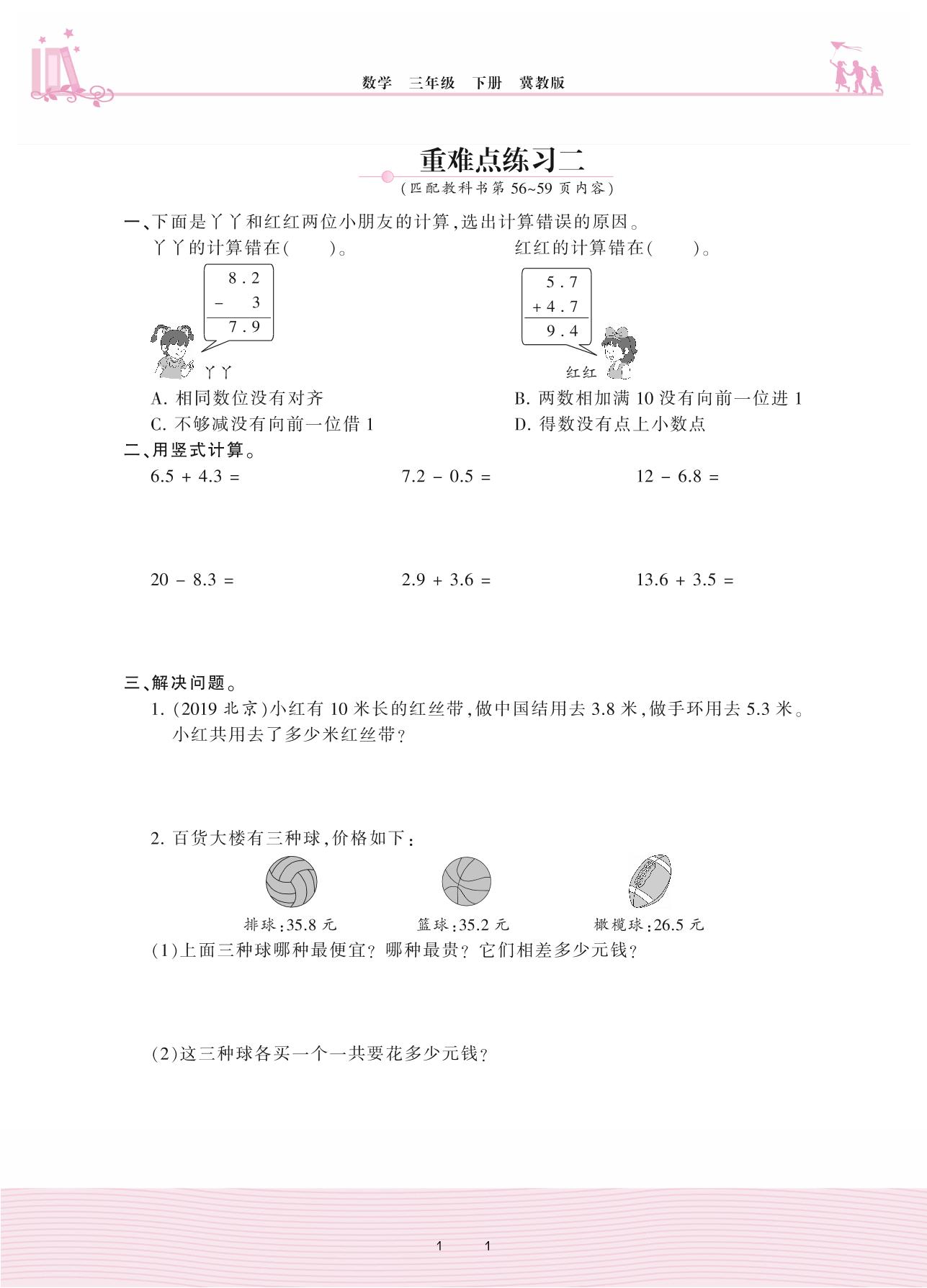 2021下册三年级数学冀教版 六 小数的初步认识——重难点练习二