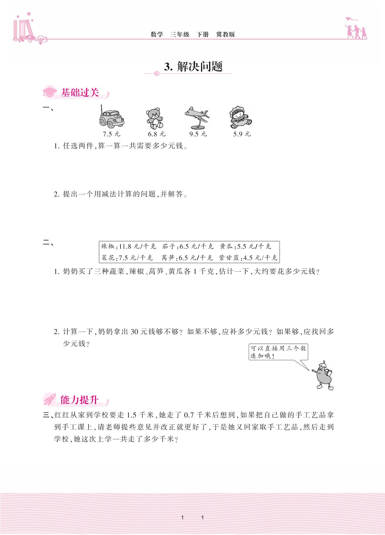 2021下册三年级数学冀教版 六 小数的初步认识 3. 解决问题