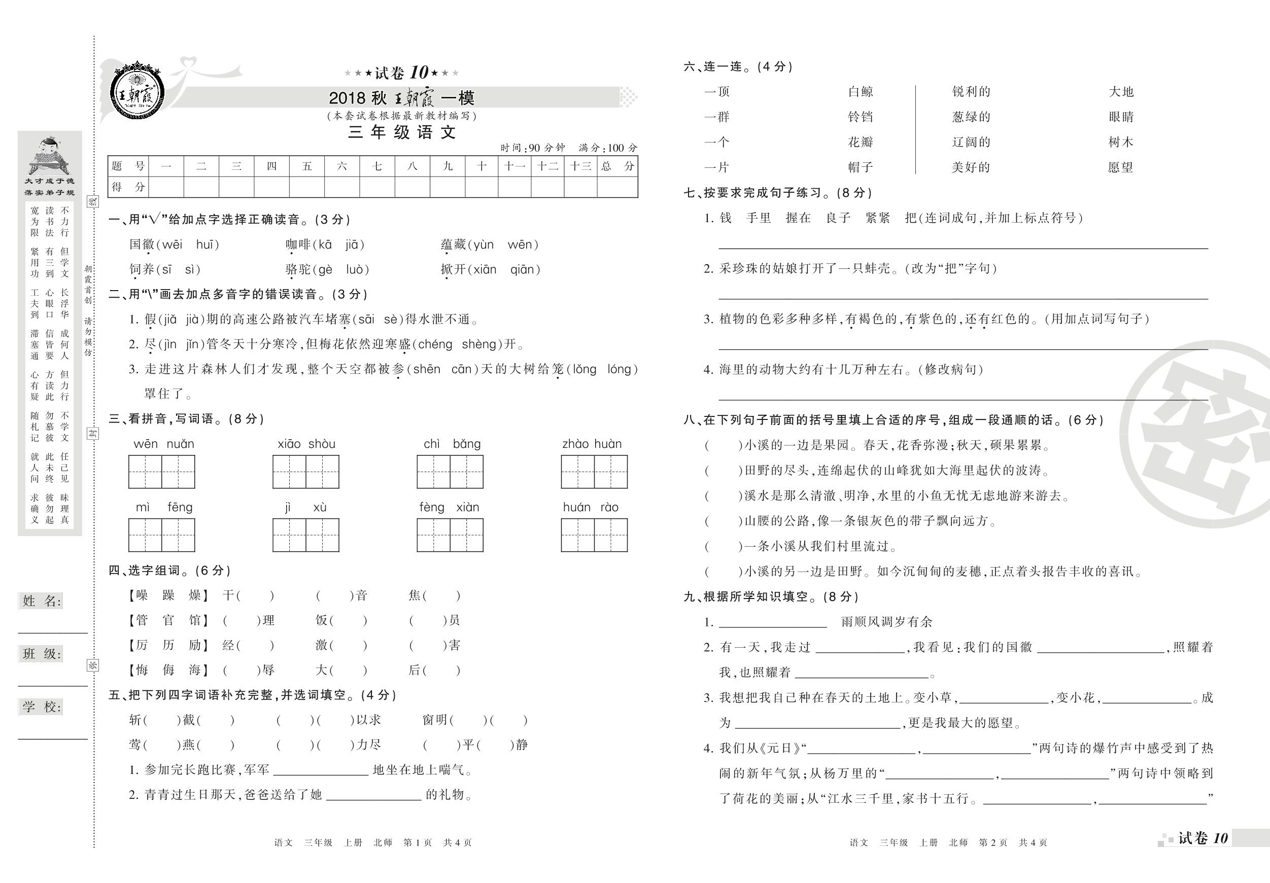 王朝霞期末模拟卷三年级上册语文(北师版)【10】