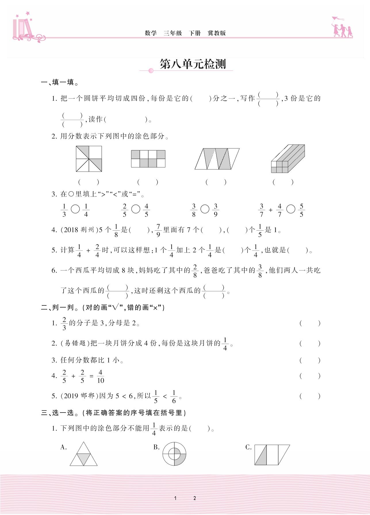 2021下册三年级数学冀教版 八 分数的初步认识——第八单元检测