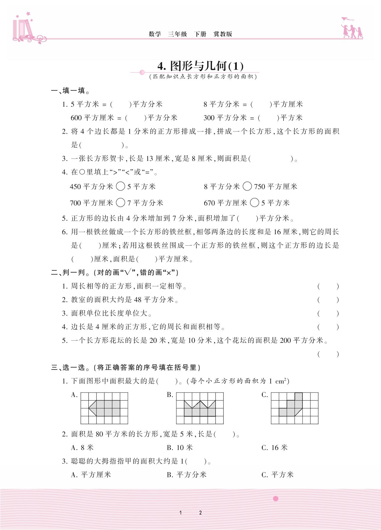 2021下册三年级数学冀教版 整理与评价——4. 图形与几何(1)