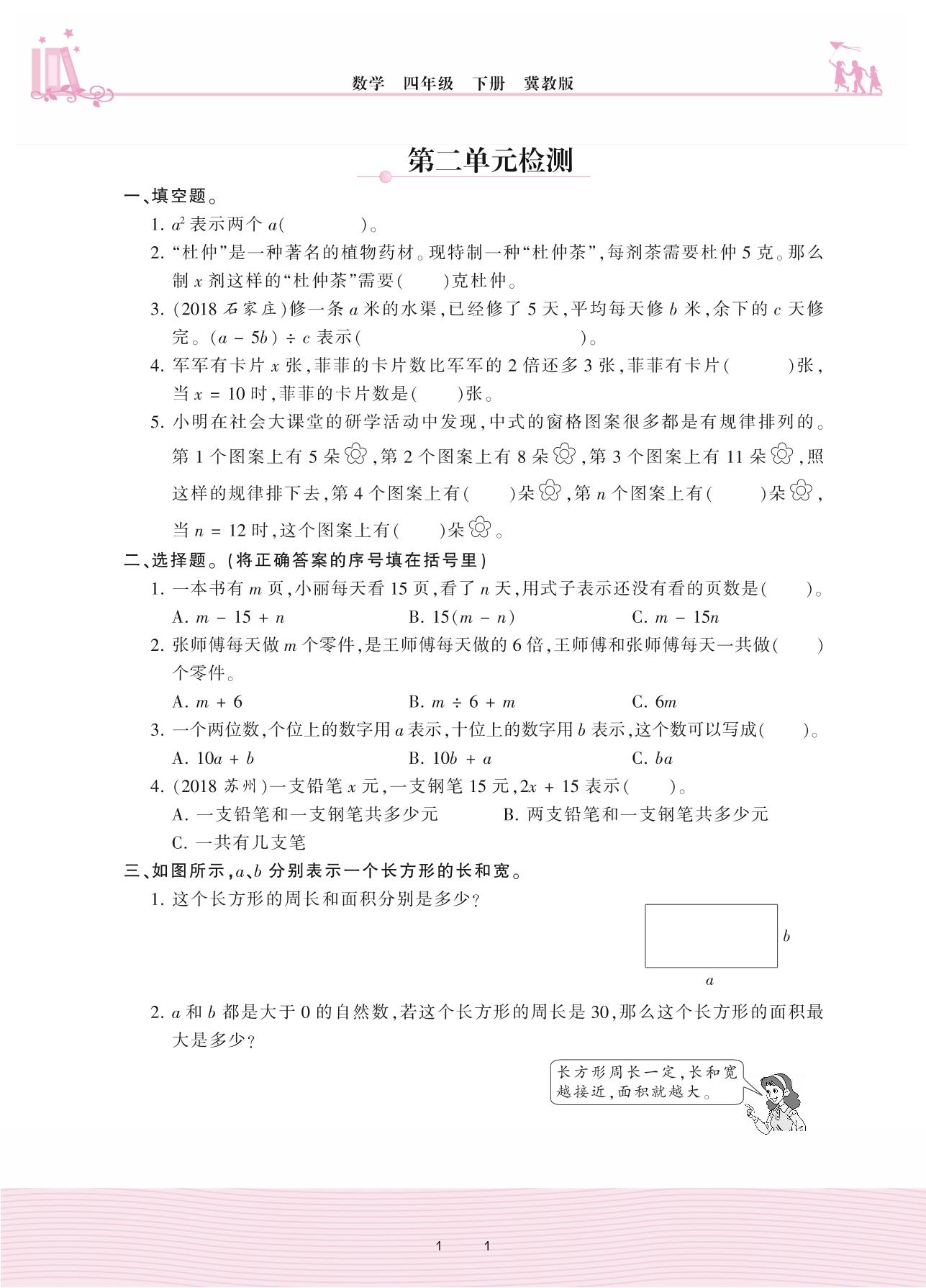 2021下册四年级数学冀教版 二 用字母表示数——第二单元检测