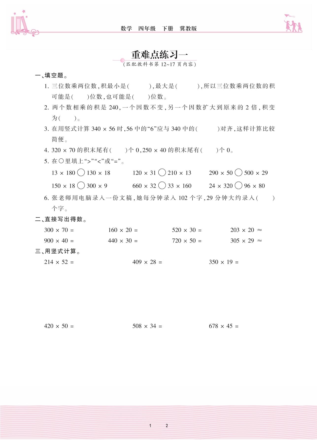 2021下册四年级数学冀教版 三 三位数乘两位数——重难点练习一