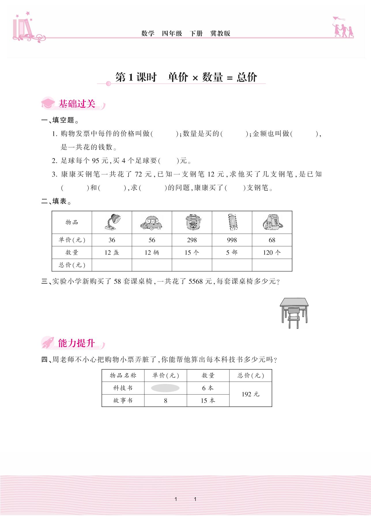 2021下册四年级数学冀教版 三 三位数乘两位数 2. 数量关系——第1课时 单价 × 数量 = 总价