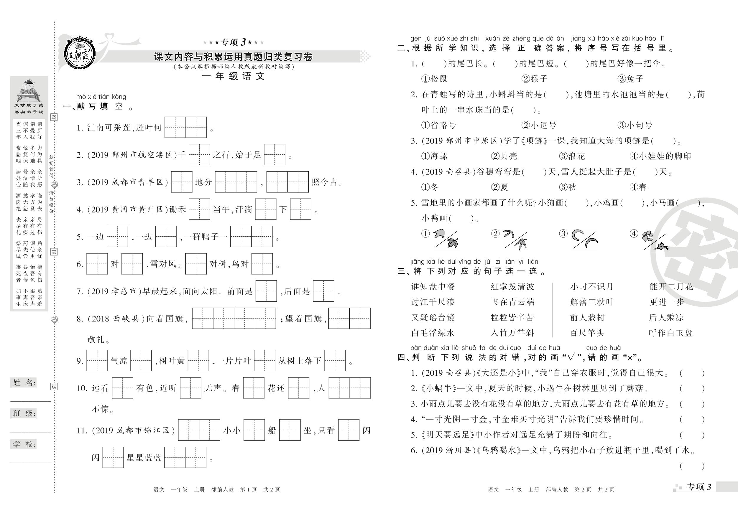 王朝霞期末专项卷——课文内容与积累运用、口语交际与写话真题归类复习卷一年级上册语文(人教版)_R210731180512【0】