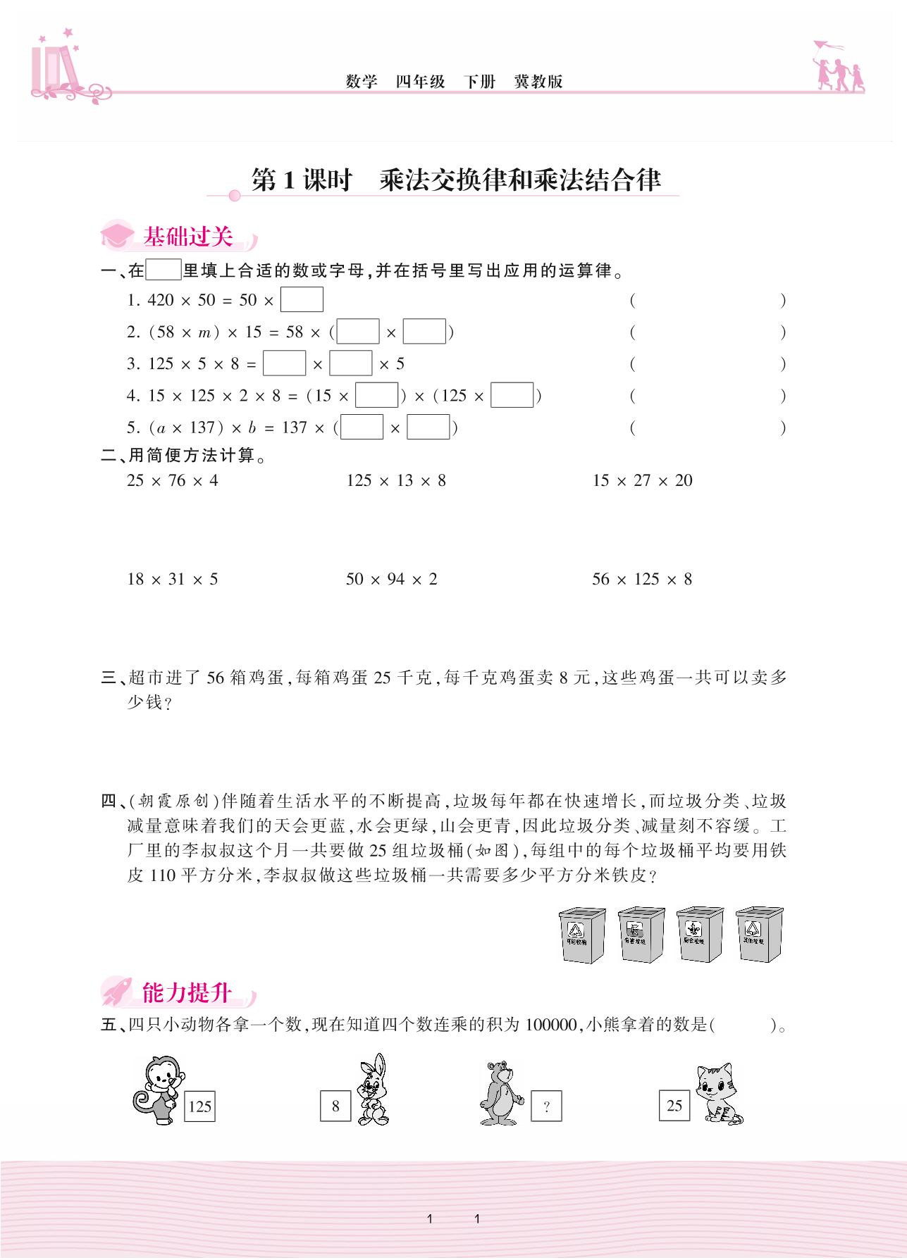 2021下册四年级数学冀教版 三 三位数乘两位数 3. 乘法运算律——第1课时 乘法交换律和乘法结合律