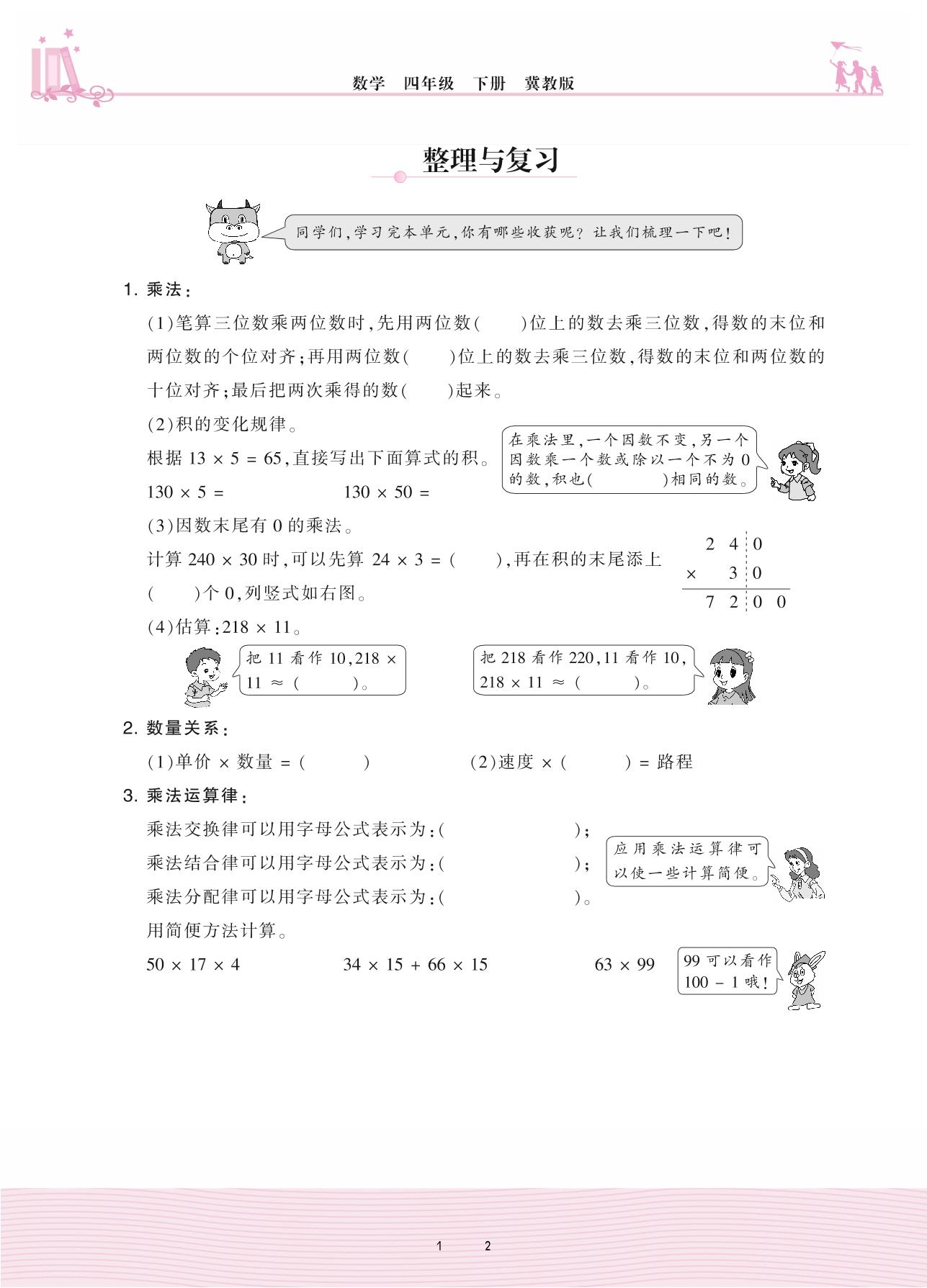 2021下册四年级数学冀教版 三 三位数乘两位数——整理与复习