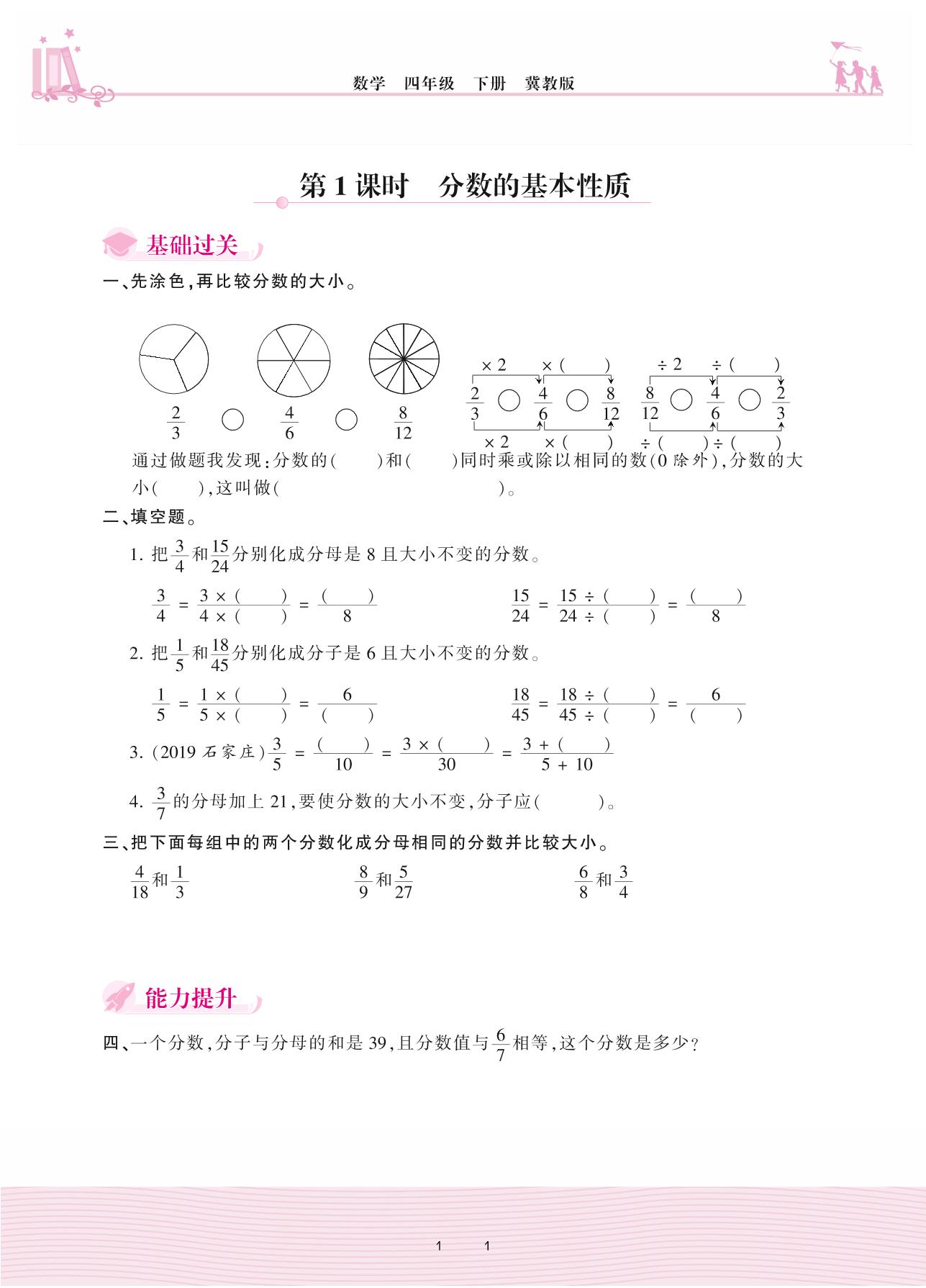 2021下册四年级数学冀教版 五 分数的意义和性质 3. 分数的基本性质——第1课时 分数的基本性质