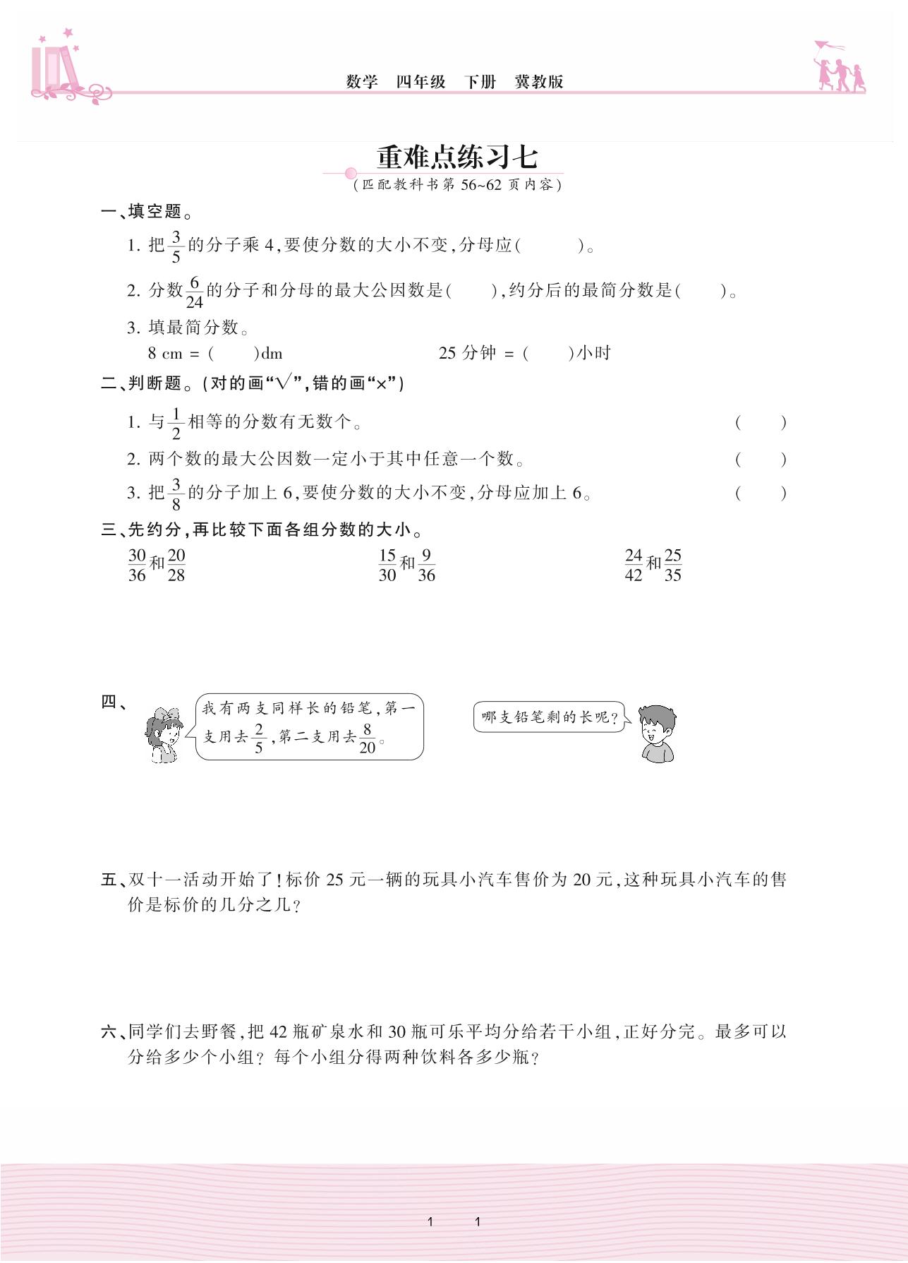 2021下册四年级数学冀教版 五 分数的意义和性质——重难点练习七