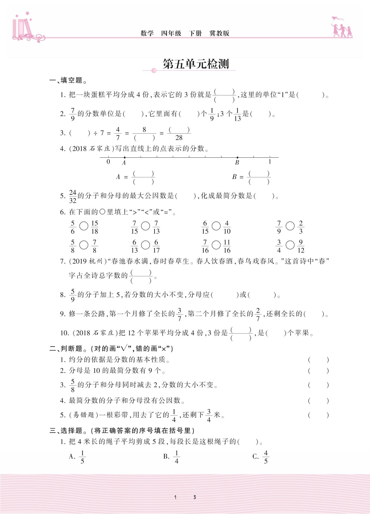 2021下册四年级数学冀教版 五 分数的意义和性质——第五单元检测