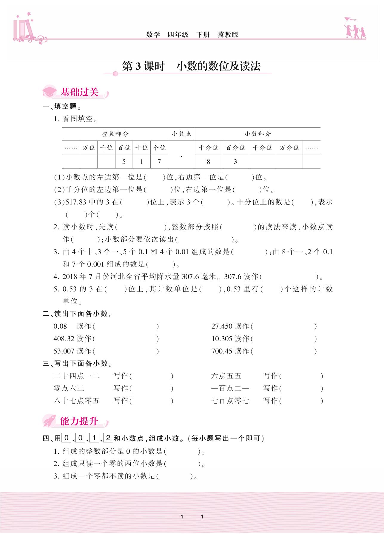 2021下册四年级数学冀教版 六 小数的认识——第3课时 小数的数位及读法