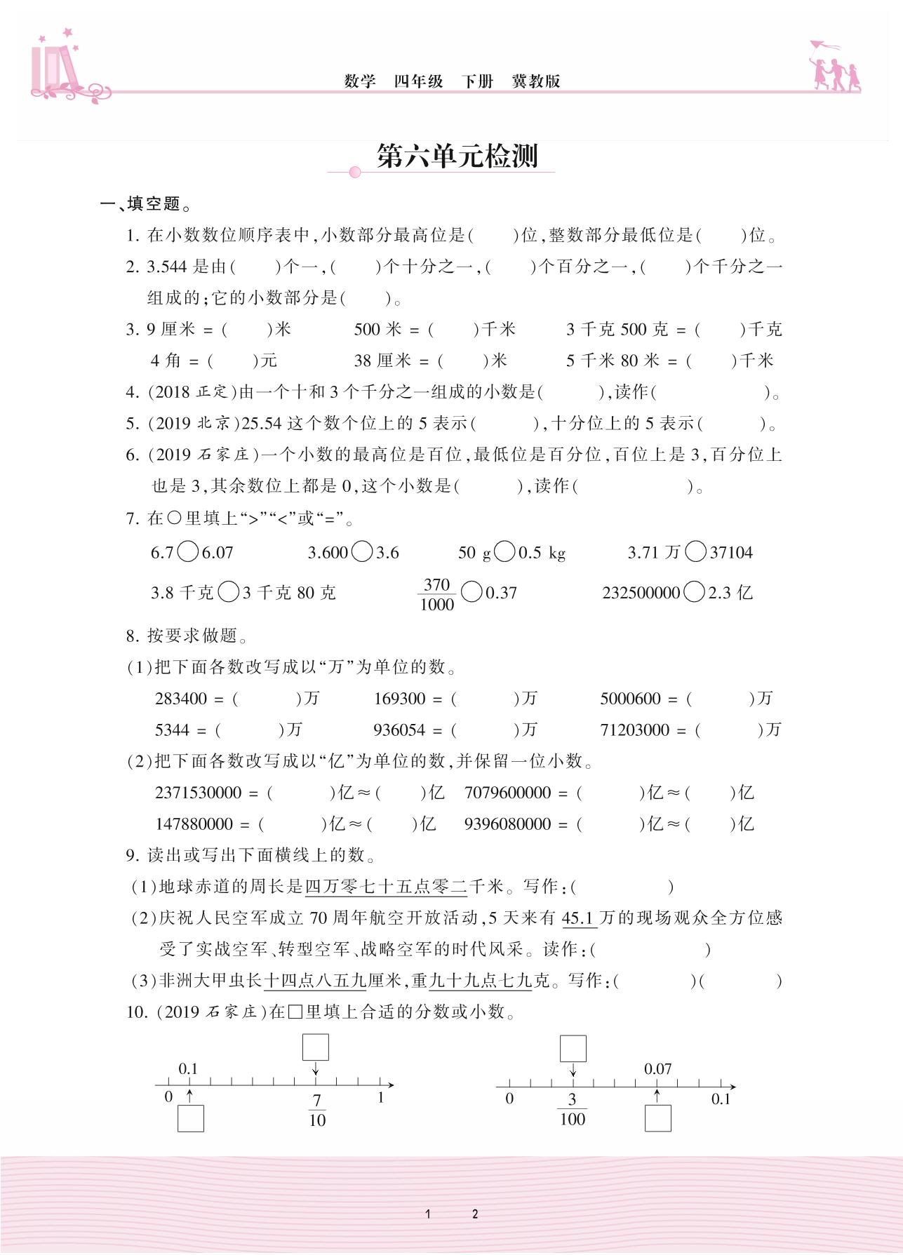 2021下册四年级数学冀教版 六 小数的认识——第六单元检测