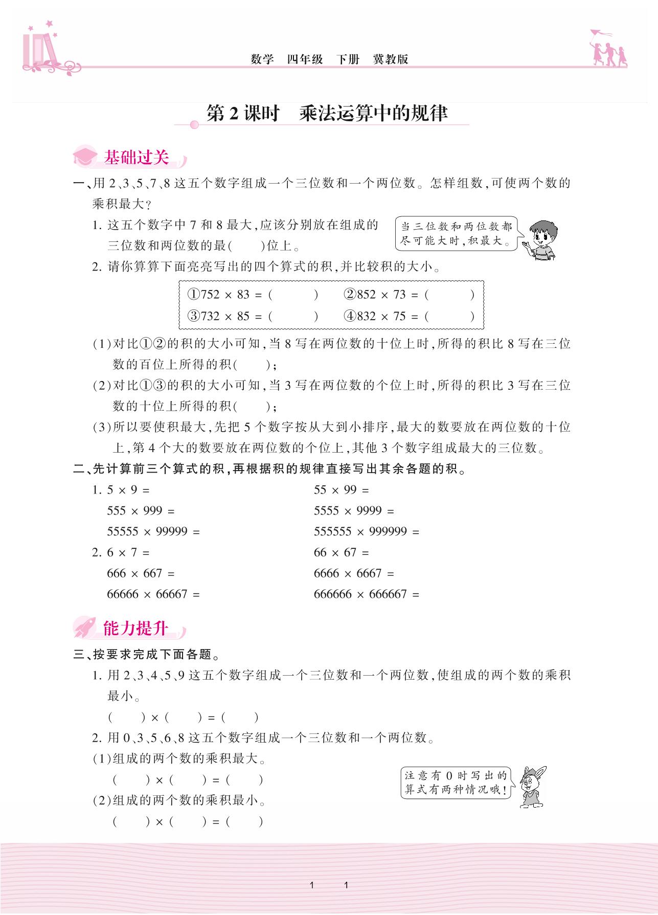 2021下册四年级数学冀教版 九 探索乐园——第2课时 乘法运算中的规律