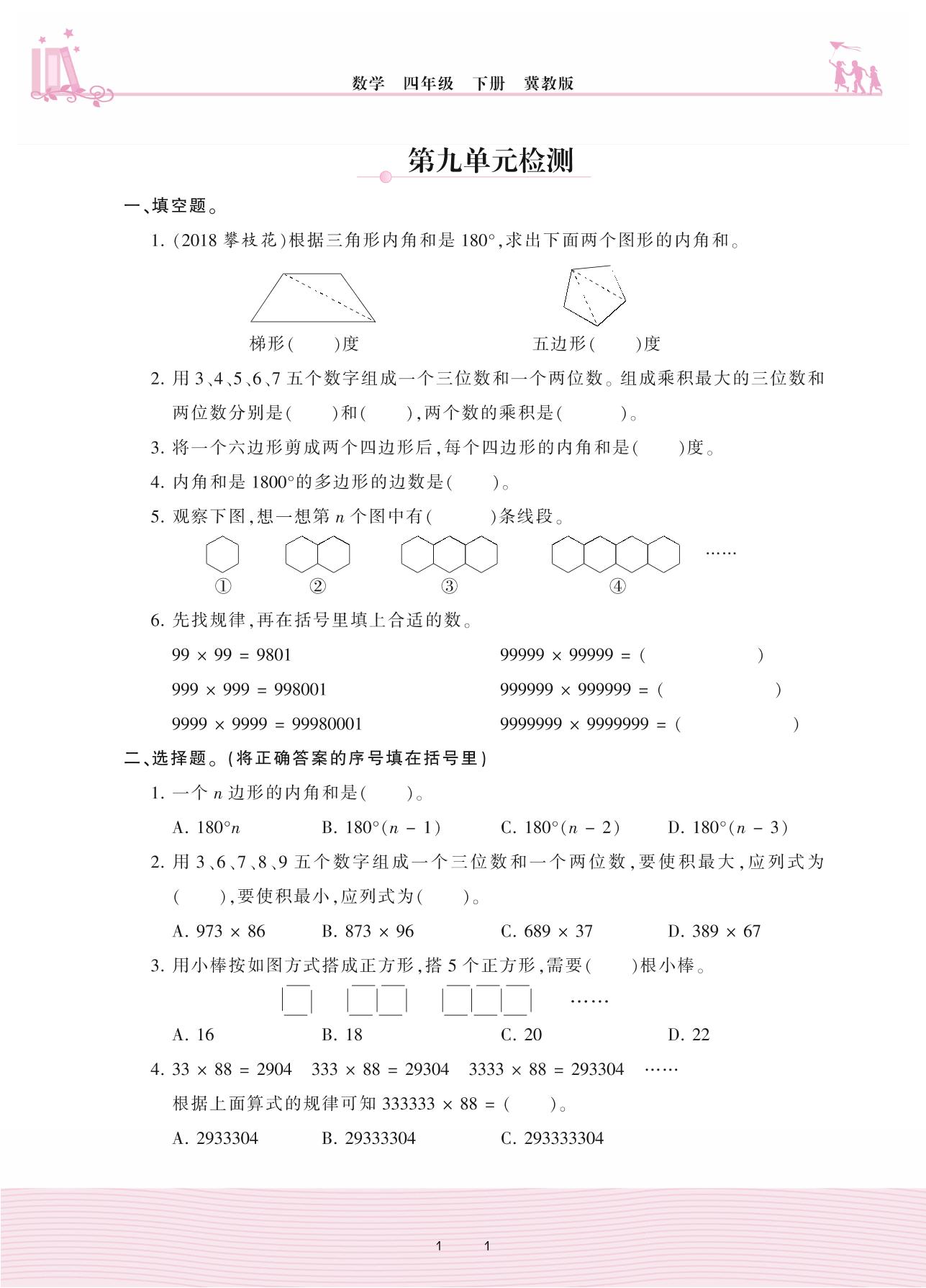 2021下册四年级数学冀教版 九 探索乐园——第九单元检测