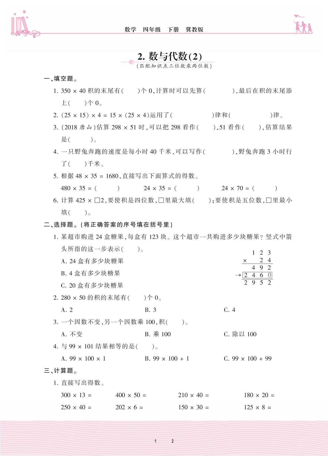 2021下册四年级数学冀教版 整理与评价——2. 数与代数(2)