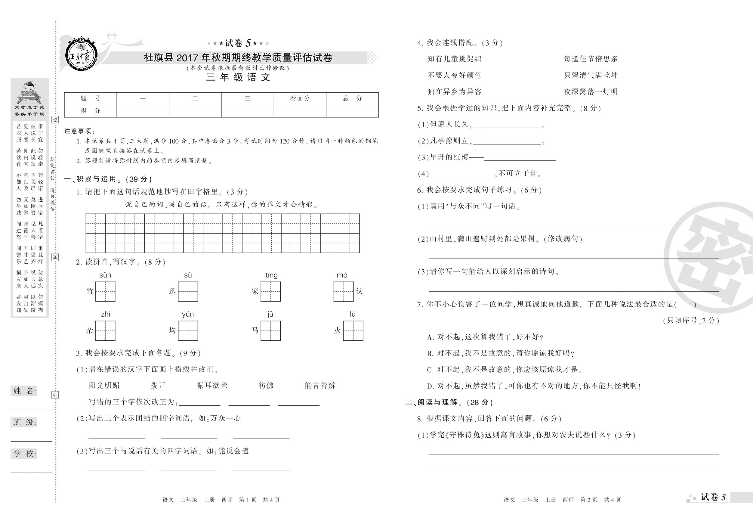 2017-2018学年第一学期南阳市社旗县三年级语文试卷(西师版)【5】