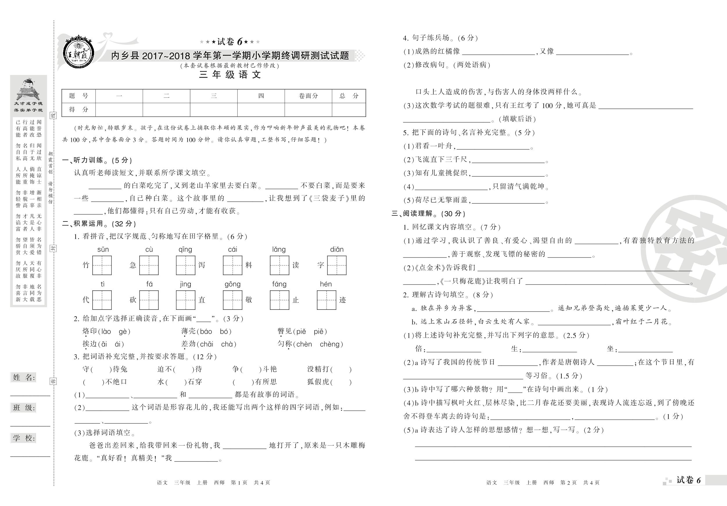 2017-2018学年第一学期南阳市内乡县三年级语文试卷(西师版)【6】