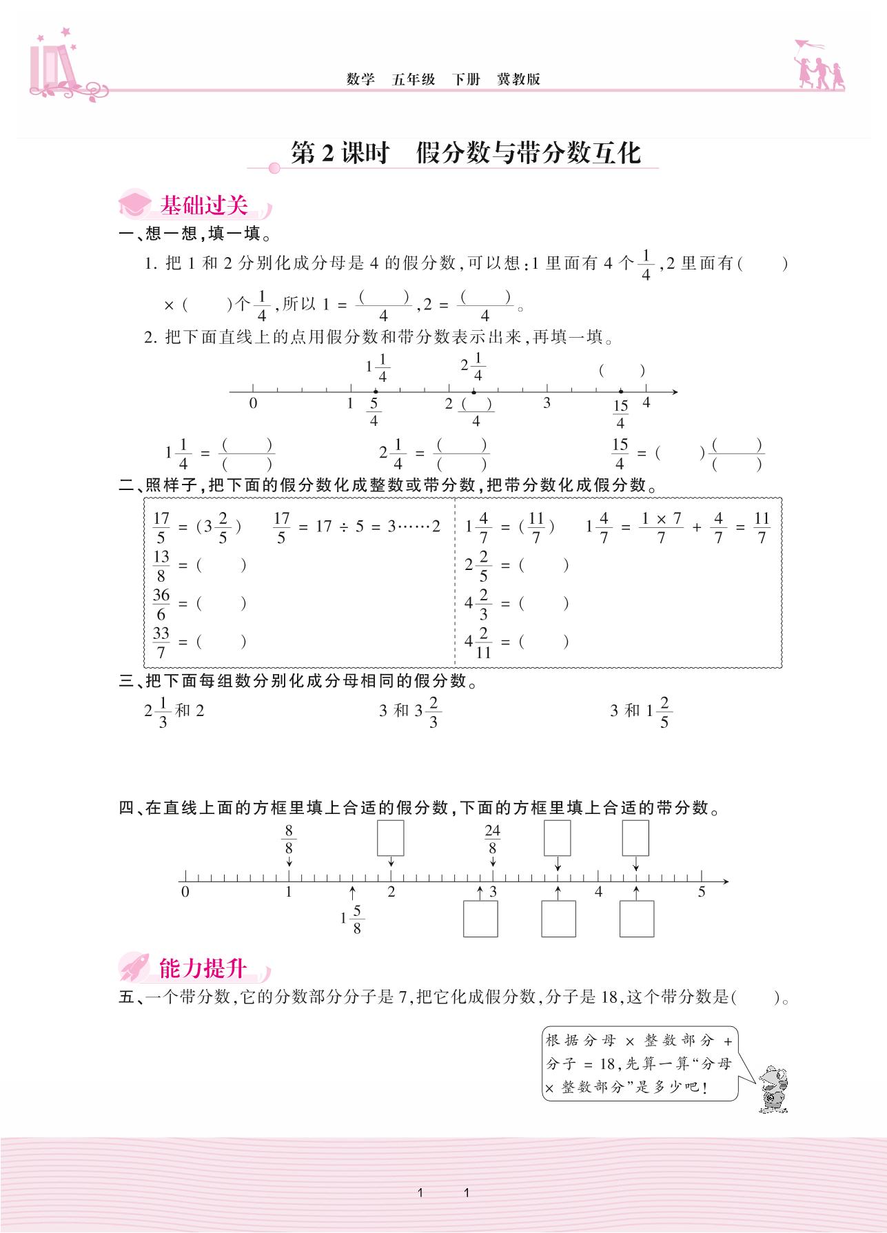 2021下册五年级数学冀教版 二 异分母分数加减法 1. 真分数与假分数——第2课时 假分数与带分数互化