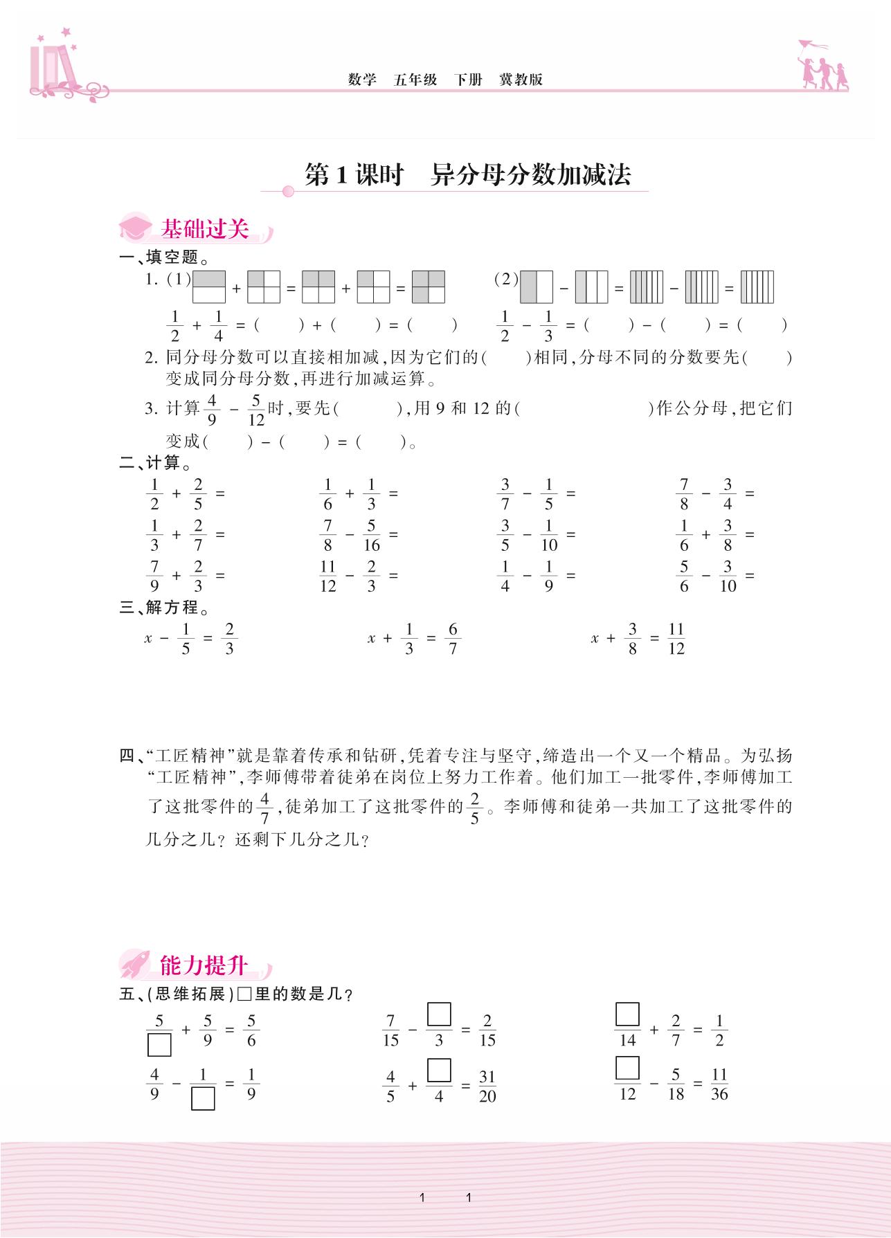 2021下册五年级数学冀教版 二 异分母分数加减法 4. 异分母分数加减——第1课时 异分母分数加减法