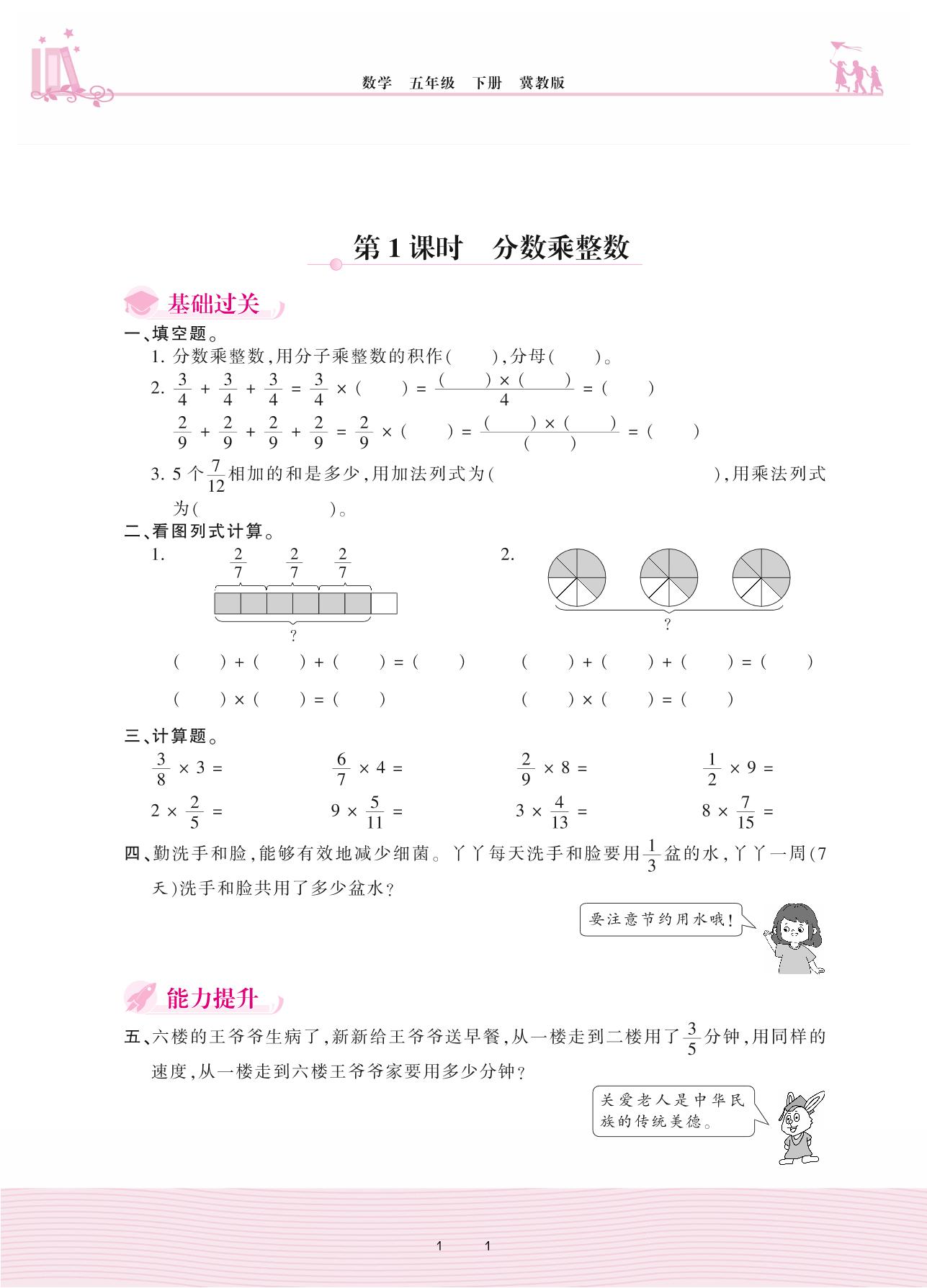 2021下册五年级数学冀教版 四 分数乘法 1. 分数乘法——第1课时 分数乘整数